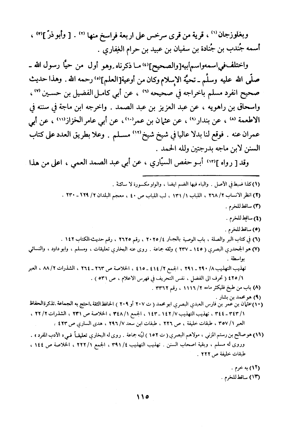 واختلف في اسمه واسم أبيه [والصحيح] ما ذكرناه. وهو أول من حيا رسول الله - صلى الله عليه وسلم - تحية الإسلام وكان من أوعية [العلم] رحمه الله. وهذا حديث صحيح انفرد مسلم بإخراجه في صحيحه، عن أبي كامل الفضيل بن حسين، وإسحاق بن راهويه، عن عبد العزيز بن عبد الصمد. وأخرجه ابن ماجة في سننه في الأطعمة، عن بندار، عن عثمان بن عمر، عن أبي عامر الخزاز، عن أبي عمران عنه. فوقع لنا بدلاً عالياً في شيخ شيخ مسلم. وعلا بطريق العدد على كتاب السنن لابن ماجه بدرجتين ولله الحمد.