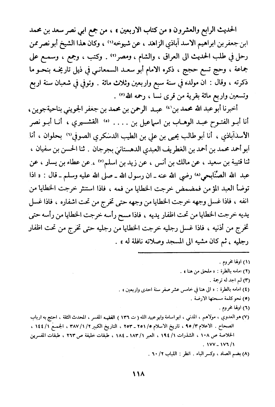 الحديث الرابع والعشرون ((من كتاب الأربعين)) ، من جمع أبي نصر سعد بن محمد ابن جعفر بن إبراهيم الأسدآباذي الزاهد، عن شيوخه، وكان هذا الشيخ أبو نصر ممن رحل في طلب الحديث إلى العراق، والشام، ومصر. وكتب، وجمع، وسمع على جماعة، وحج تسع حجج، ذكره الإمام أبو سعد السمعاني في ذيل تاريخه بنحو ما ذكرته، وقال: إن مولده في سنة سبع وأربعين وثلاث مائة. وتوفي في شعبان سنة أربع وتسعين وأربع مائة بقرية من قرى نسا، رحمه الله.