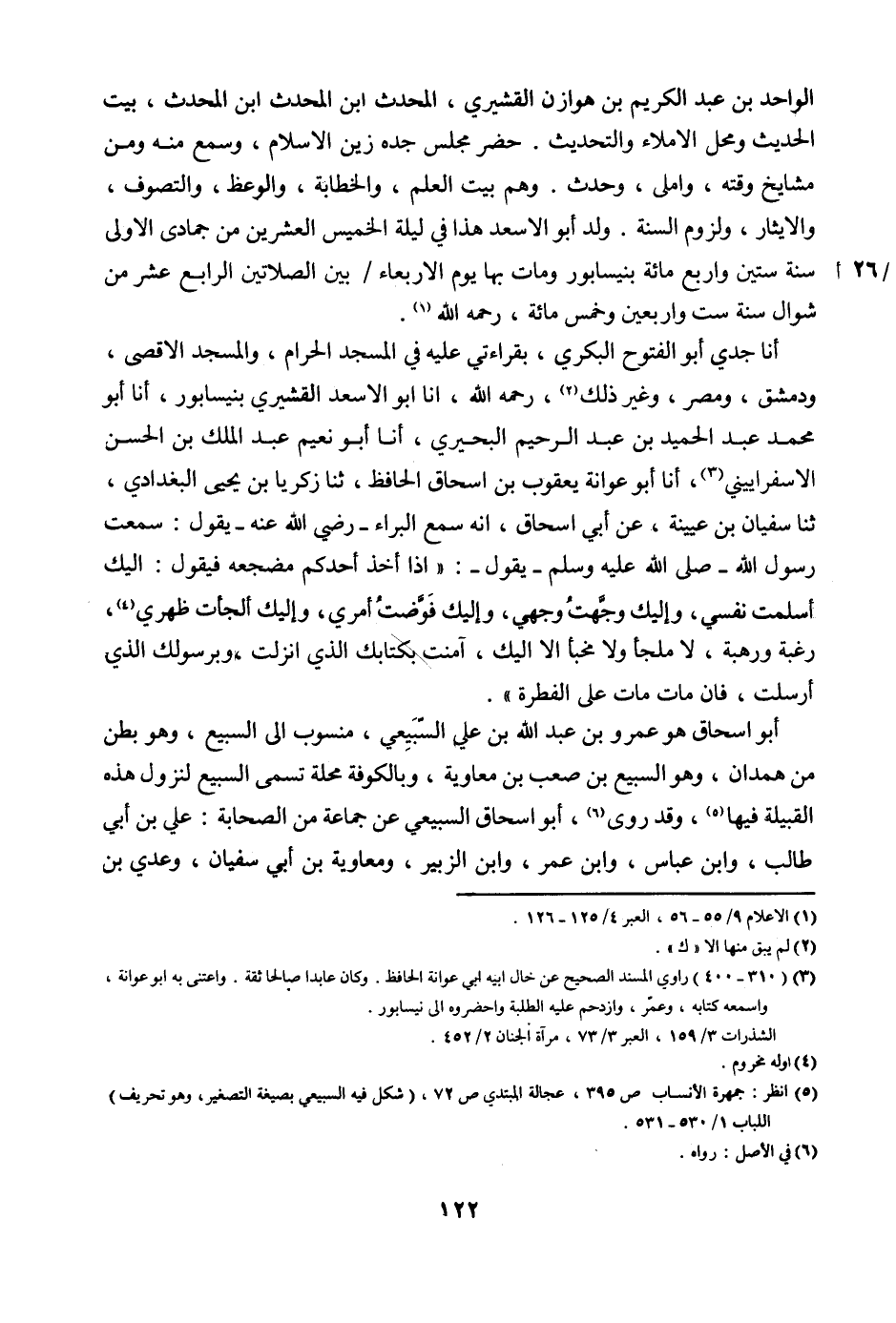 الواحد بن عبد الكريم بن هوازن القشيري، المحدث ابن المحدث ابن المحدث، بيت الحديث ومحل الإملاء والتحديث. حضر مجلس جده زين الإسلام، وسمع منه ومن مشايخ وقته، وأملى، وحدث. وهم بيت العلم، والخطابة، والوعظ، والتصوف، والإيثار، ولزوم السنة. ولد أبو الأسعد هذا في ليلة الخميس العشرين من جمادى الأولى سنة ستين وأربع مائة بنيسابور ومات بها يوم الأربعاء بن الصلاتين الرابع عشر من شوال سنة ست وأربعين وخمس مائة، رحمه الله.
