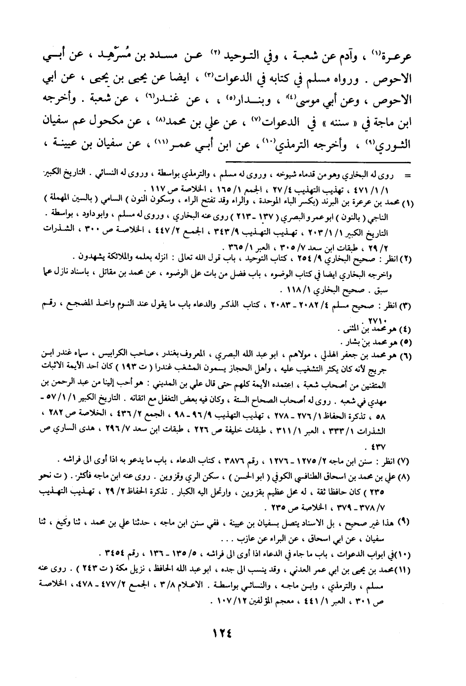 عرعرة، وآدم عن شعبة، وفي التوحيد عن مسدد بن مسرهد، عن أبي الأحوص. ورواه مسلم في كتابه في الدعوات، أيضاً عن يحيى بن يحيى، عن أبي الأحوص، وعن أبي موسى، وبندار، عن غندر، عن شعبة. وأخرجه ابن ماجة في ((سننه)) في الدعوات، عن علي بن محمد، عن مكحول عم سفيان الثوري، وأخرجه الترمذي، عن ابن أبي عمر، عن سفيان بن عيينة،