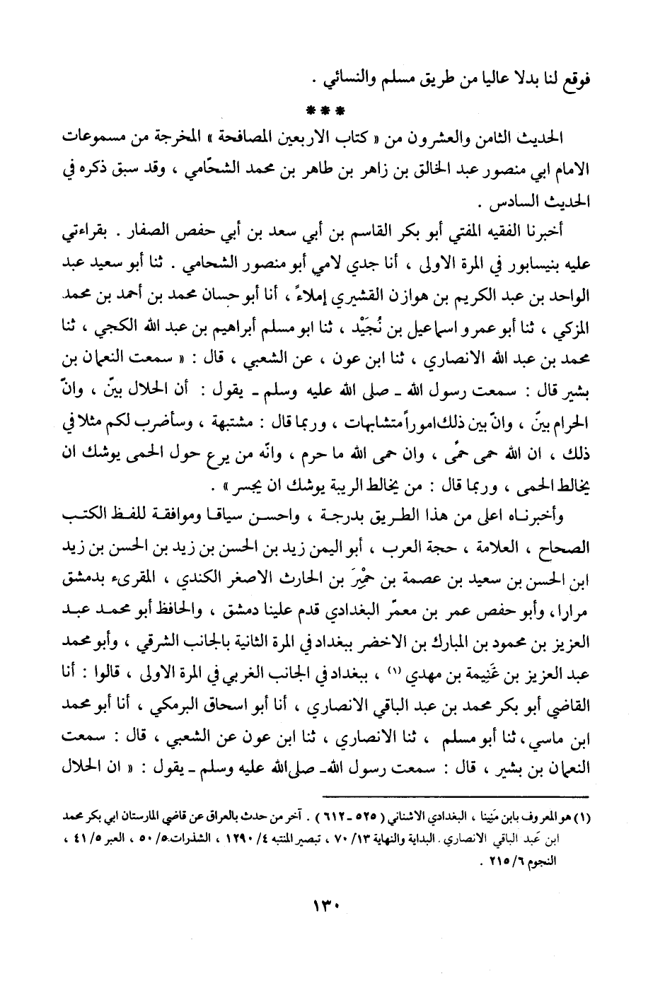 وأخبرناه أعلى من هذا الطريق بدرجة، وأحسن سياقاً وموافقة للفظ الكتب الصحاح، العلامة، حجة العرب، أبو اليمن زيد بن الحسن بن زيد بن الحسن بن زيد ابن الحسن بن سعيد بن عصمة بن حمير بن الحارث الأصغر الكندي، المقرئ بدمشق مراراً، وأبو حفص عمر بن معمر البغدادي قدم علينا دمشق، والحافظ أبو محمد عبد العزيز بن محمود بن المبارك بن الأخضر ببغداد في المرة الثانية بالجانب الشرقي، وأبو محمد عبد العزيز بن غنيمة بن مهدي، ببغداد في الجانب الغربي في المرة الأولى، قالوا: أنا القاضي أبو بكر محمد بن عبد الباقي الأنصاري، أنا أبو إسحاق البرمكي، أنا أبو محمد ابن ماسي، ثنا أبو مسلم، ثنا الأنصاري، ثنا ابن عون عن الشعبي، قال: سمعت النعمان بن بشير، قال: سمعت رسول الله - صلى الله عليه وسلم - يقول: ((أن الحلال