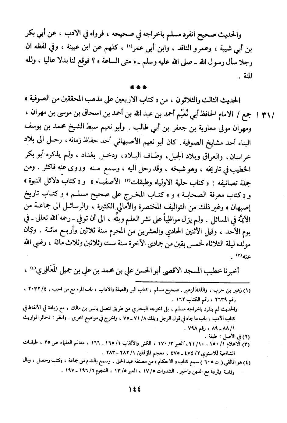 الحديث الثالث والثلاثون، من ((كتاب الأربعين على مذهب المحققين من الصوفية)) جمع الإمام الحافظ أبي نعيم أحمد بن عبد الله بن أحمد بن إسحاق بن موسى بن مهران، ومهران مولى معاوية بن جعفر بن أبي طالب. وأبو نعيم سبط الشيخ محمد بن يوسف البناء أحد مشايخ الصوفية. كان أبو نعيم الأصبهاني أحد حفاظ زمانه، رحل إلى بلاد خراسان، والعراق بلاد الجبل، وطاف البلاد، ودخل بغداد، ولم يذكره أبو بكر الخطيب في تاريخه، وهو شيخه، وقد رحل إليه، وسمع منه وروى عنه فأكثر. ومن جملة تصانيفه: ((كتاب حلية الأولياء وطبقات الأصفياء)) و ((كتاب دلائل النبوة)) و ((كتاب معرفة الصحابة)) و ((كتاب المخرج على صحيح مسلم)) و ((كتاب تاريخ إصبهان)) وغير ذلك من التواليف المختصرة والأمالي الكثيرة، والرسائل إلى جماعة من الأيمة في المسائل. ولم يزل مواظباً على نشر العلم وبثه، إلى أن توفي -رحمه الله تعالى- في يوم الأحد، وقيل الاثنين الحادي والعشرين من المحرم سنة ثلاثين وأربع مائة. وكان مولده ليلة الثلاثاء لخمس بقين من جمادى الآخرة سنة ست وثلاثين وثلاث مائة، رضي الله عنه.