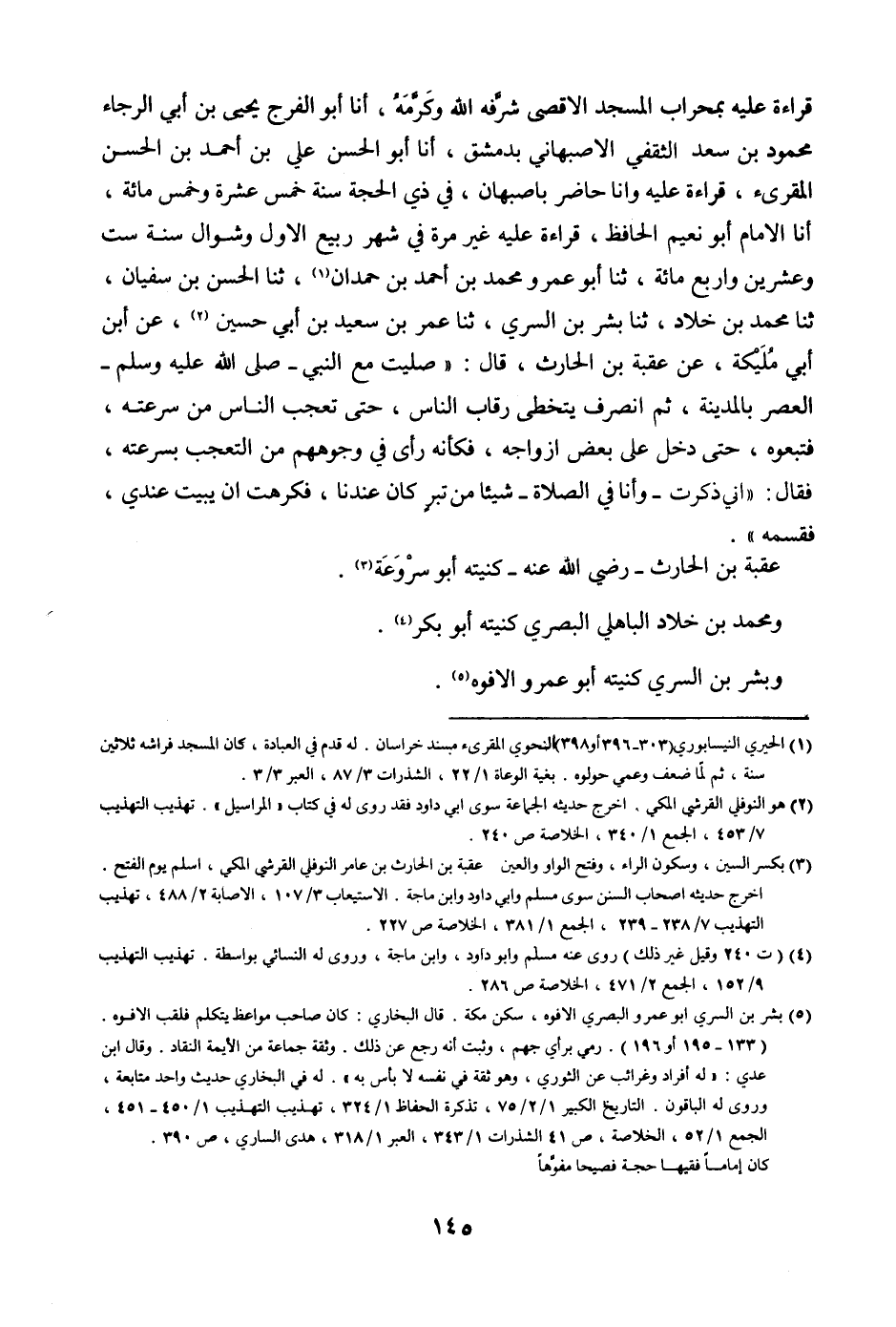 قراءة عليه بمحراب المسجد الأقصى شرفه الله وكرمه، أنا أبو الفرج يحيى بن أبي الرجاء محمود بن سعد الثقفي الأصبهاني بدمشق، أنا أبو الحسن علي بن أحمد بن الحسن المقرئ، قراءة عليه وأنا حاضر بأصبهان، في ذي الحجة سنة خمس عشرة وخمس مائة، أنا الإمام أبو نعيم الحافظ، قراءة عليه غير مرة في شهر ربيع الأول وشوال سنة ست وعشرين وأربع مائة، ثنا أبو عمرو محمد بن أحمد بن حمدان، ثنا الحسن بن سفيان، ثنا محمد بن خلاد، ثنا بشر بن السري، ثنا عمر بن سعيد بن أبي حسين، عن ابن أبي مليكة، عن عقبة بن الحارث، قال: ((صليت مع النبي - صلى الله عليه وسلم - العصر بالمدينة، ثم انصرف يتخطى رقاب الناس، حتى تعجب الناس من سرعته، فتبعوه، حتى دخل على بعض أزواجه، فكأنه رأى في وجوههم من التعجب بسرعته، فقال: ((إني ذكرت -وأنا في الصلاة- شيئاً من تبرٍ كان عندنا، فكرهت أن يبيت عندي، فقسمه)) .