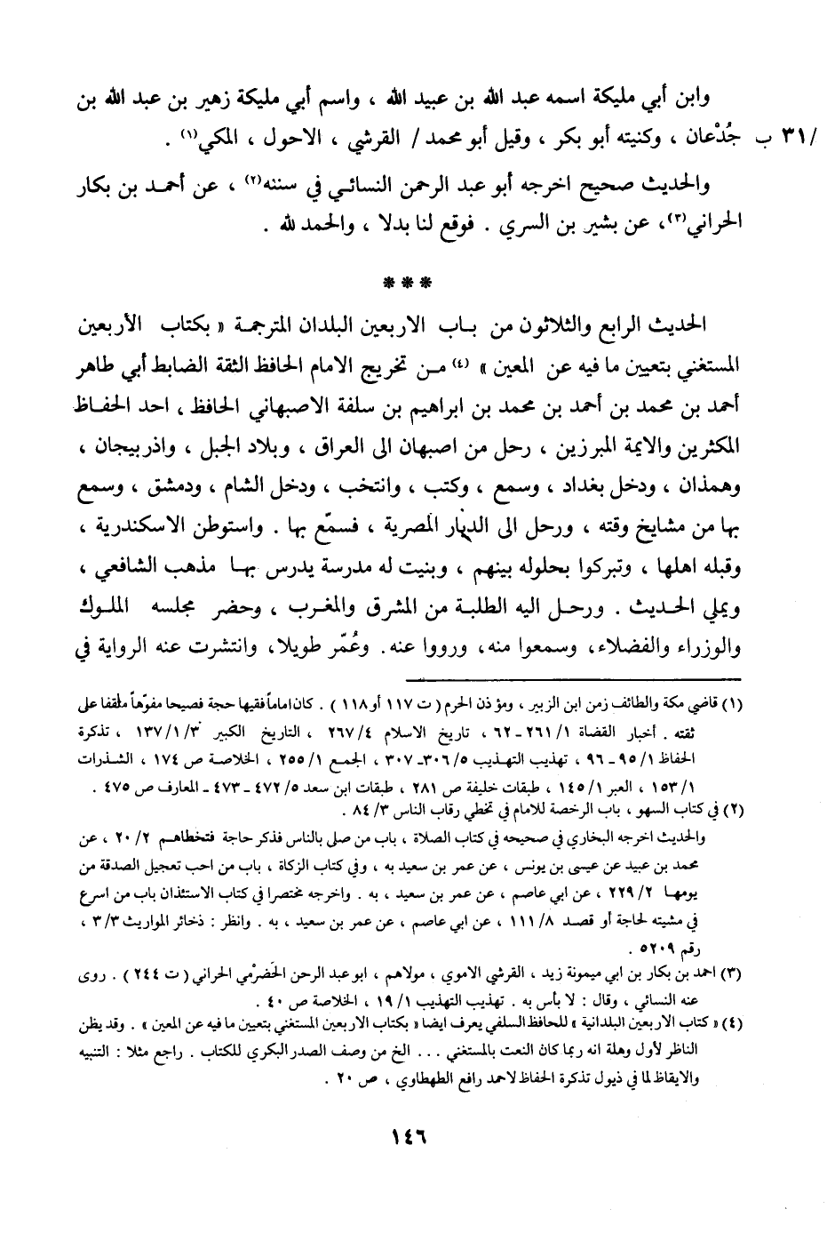 الحديث الرابع والثلاثون من باب الأربعين البلدان المترجمة ((بكتاب الأربعين المستغني بتعيين ما فيه عن المعين)) من تخريج الإمام الحافظ الثقة الضابط أبي طاهر أحمد بن محمد بن أحمد بن محمد بن إبراهيم بن سلفة الأصبهاني الحافظ، أحد الحفاظ المكثرين والأيمة المبرزين، رحل من أصبهان إلى العراق، وبلاد الجبل، وأذربيجان، وهمذان، ودخل بغداد، وسمع، وكتب، وانتخب، ودخل الشام، ودمشق، وسمع بها من مشايخ وقته، ورحل إلى الديار المصرية، فسمع بها. واستوطن الإسكندرية، وقبله أهلها، وتبركوا بحلوله بينهم، وبنيت له مدرسة يدرس بها مذهب الشافعي، ويملي الحديث. ورحل إليه الطلبة من المشرق والمغرب، وحضر مجلسه الملوك والوزراء والفضلاء، وسمعوا منه، ورووا عنه. وعمر طويلاً، وانتشرت عنه الرواية في