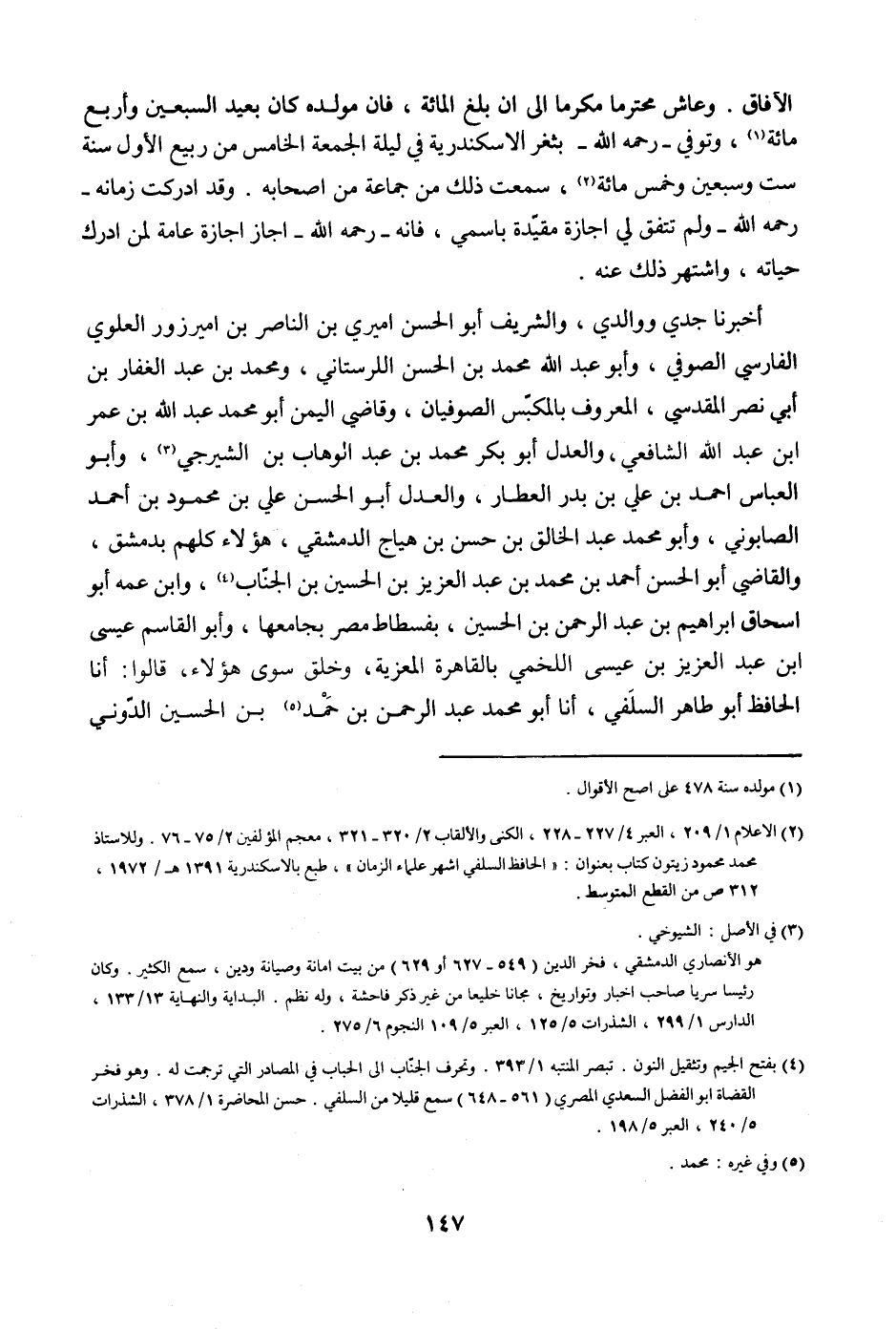 أخبرنا جدي ووالدي، والشريف أبو الحسن أميري بن الناصر بن أميرزور العلوي الفارسي الصوفي، وأبو عبد الله محمد بن الحسن اللرستاني، ومحمد بن عبد الغفار بن أبي نصر المقدسي، المعروف بالمكبس الصوفيان، وقاضي اليمن أبو محمد عبد الله بن عمر ابن عبد الله الشافعي، والعدل أبو بكر محمد بن عبد الوهاب بن الشيرجي، وأبو العباس أحمد بن علي بن بدر العطار، والعدل أبو الحسن علي بن محمود بن أحمد الصابوني، وأبو محمد عبد الخالق بن حسن بن هياج الدمشقي، هؤلاء كلهم بدمشق، والقاضي أبو الحسن أحمد بن محمد بن عبد العزيز بن الحسين بن الجناب، وابن عمه أبو إسحاق إبراهيم بن عبد الرحمن بن الحسين، بفسطاط مصر بجامعها، وأبو القاسم عيسى ابن عبد العزيز بن عيسى اللخمي بالقاهرة المعزية، وخلق سوى هؤلاء، قالوا: أنا الحافظ أبو طاهر السلفي، أنا أبو محمد عبد الرحمن بن حمد بن الحسين الدوني