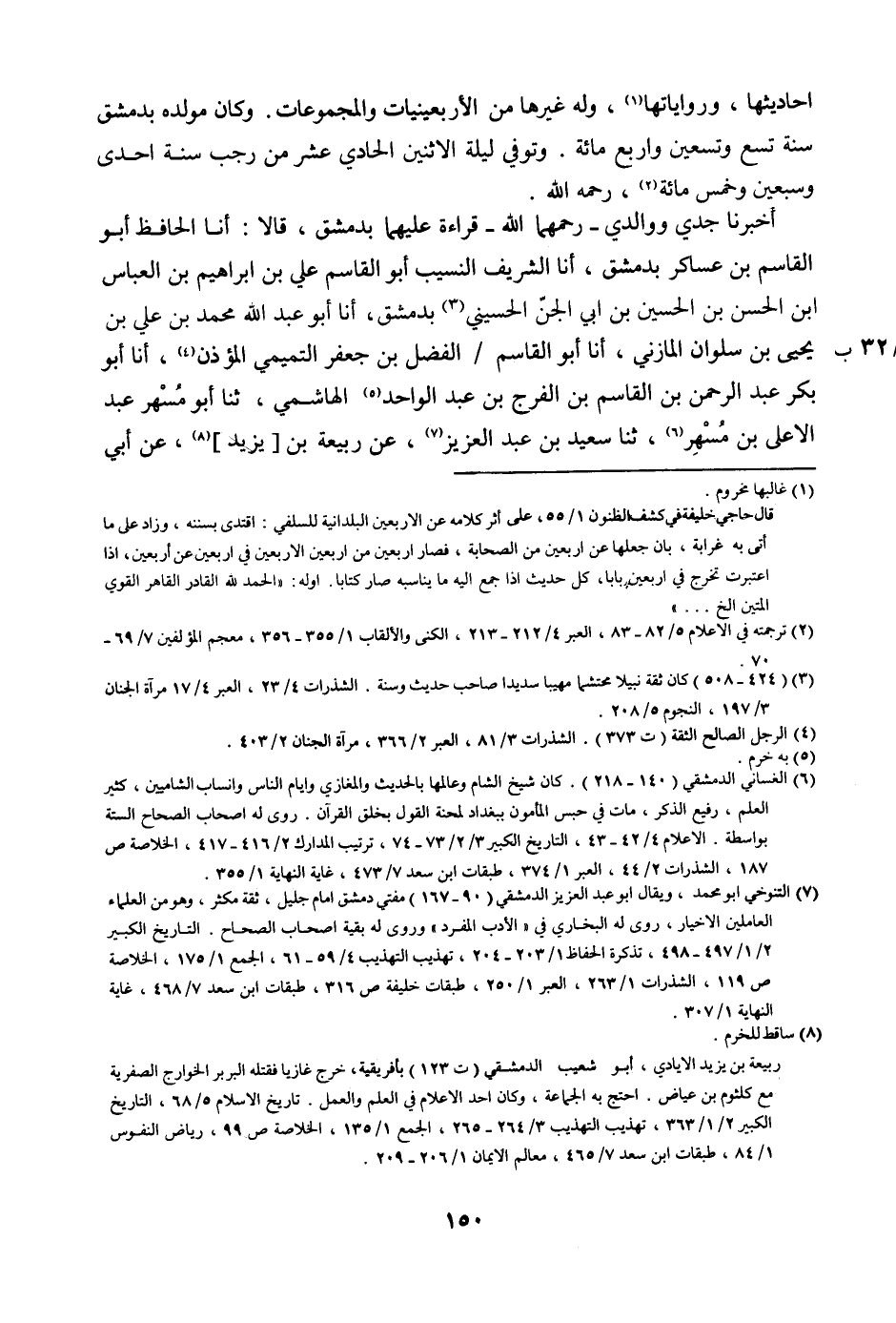 أحاديثها، ورواياتها، وله غيرها من الأربعينيات والمجموعات. وكان مولده بدمشق سنة تسع وتسعين وأربع مائة. وتوفي ليلة الاثنين الحادي عشر من رجب سنة إحدى وسبعين وخمس مائة، رحمه الله.