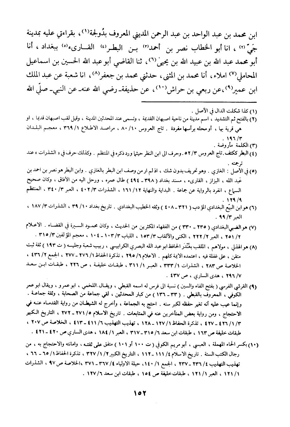 ابن محمد بن عبد الواحد بن عبد الرحمن المديني المعروف بدولجة، بقراءتي عليه بمدينة جي، أنا أبو الخطاب نصر بن أحمد بن البطر القارئ ببغداد، أنا أبو محمد عبد الله بن عبيد الله بن يحيى، ثنا القاضي أبو عبد الله الحسين بن إسماعيل المحاملي إملاء، أنا محمد بن المثنى، حدثني محمد بن جعفر، أنا شعبة عن عبد الملك ابن عمير، عن ربعي بن حراش، عن حذيفة -رضي الله عنه- عن النبي - صلى الله عليه وسلم -