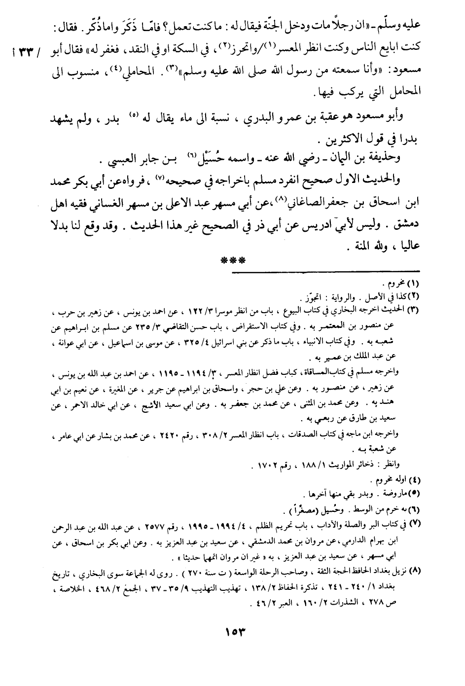((أن رجلاً مات ودخل الجنة فيقال له: ما كنت تعمل؟ فأما ذكر وأما ذكر. فقال: كنت أبايع الناس وكنت أنظر المعسر وأتحرز، في السكة أو في النقد، فغفر له)) فقال أبو مسعود: ((وأنا سمعته من رسول الله صلى الله عليه وسلم)) . المحاملي، منسوب إلى المحامل التي يركب فيها.
