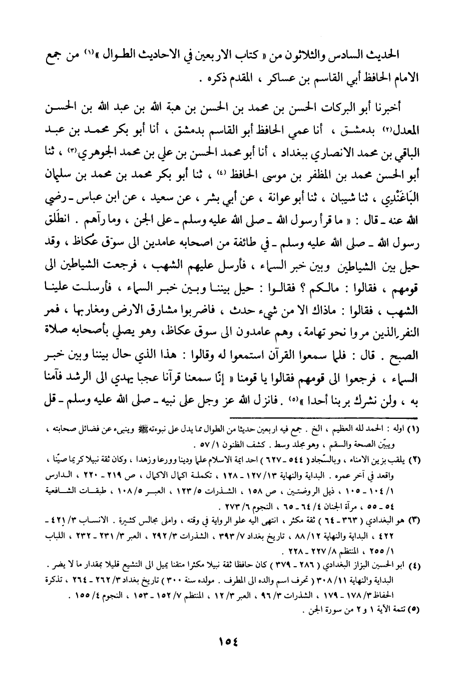 أخبرنا أبو البركات الحسن بن محمد بن الحسن بن هبة الله بن عبد الله بن الحسن المعدل بدمشق، أنا عمي الحافظ أبو القاسم بدمشق، أنا أبو بكر محمد بن عبد الباقي بن محمد الأنصاري ببغداد، أنا أبو محمد الحسن بن علي بن محمد الجوهري، ثنا أبو الحسن محمد بن المظفر بن موسى الحافظ، ثنا أبو بكر محمد بن محمد بن سليمان الباغندي، ثنا شيبان، ثنا أبو عوانة، عن أبي بشر، عن سعيد، عن ابن عباس -رضي الله عنه- قال: ((ما قرأ رسول الله - صلى الله عليه وسلم - على الجن، وما رآهم. انطلق رسول الله - صلى الله عليه وسلم - في طائفة من أصحابه عامدين إلى سوق عكاظ، وقد حيل بن الشياطين وبين خبر السماء، فأرسل عليهم الشهب، فرجعت الشياطين إلى قومهم، فقالوا: مالكم؟ فقالوا: حيل بيننا وبين خبر السماء، فأرسلت علينا الشهب، فقالوا: ما ذاك إلا من شيء حدث، فاضربوا مشارق الأرض ومغاربها، فمر النفر الذين مروا نحو تهامة، وهم عامدون إلى سوق عكاظ، وهو يصلي بأصحابه صلاة الصبح. قال: فلما سمعوا القرآن استمعوا له وقالوا: هذا الذي حال بيننا وبين خبر السماء، فرجعوا إلى قومهم فقالوا يا قومنا {إنا سمعنا قرآناً عجباً يهدي إلى الرشد فآمنها به، ولن نشرك بربنا أحداً} . فأنزل الله عز وجل على نبيه - صلى الله عليه وسلم - {قل