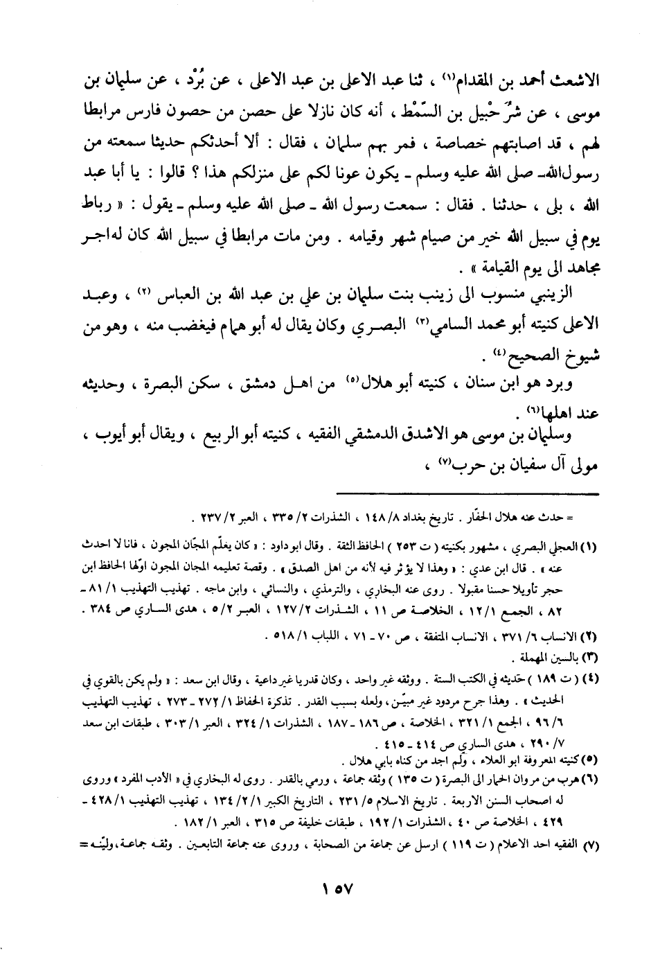 الأشعث أحمد بن المقدام، ثنا عبد الأعلى بن عبد الأعلى، عن برد، عن سليمان بن موسى، عن شرحبيل بن السمط، أنه كان نازلاً على حصن من حصون فارس مرابطاً لهم، قد أصابتهم خصاصة، فمر بهم سلمان، فقال: ألا أحدثكم حديثاً سمعته من رسول الله - صلى الله عليه وسلم - يكون عوناً لكم على منزلكم هذا؟ قالوا: يا أبا عبد الله، بلى، حدثنا. فقال: سمعت رسول الله - صلى الله عليه وسلم - يقول: ((رباط يوم في سبيل الله خير من صيام شهر وقيامه. ومن مات مرابطاً في سبيل الله كان له أجر مجاهد إلى يوم القيامة)) .