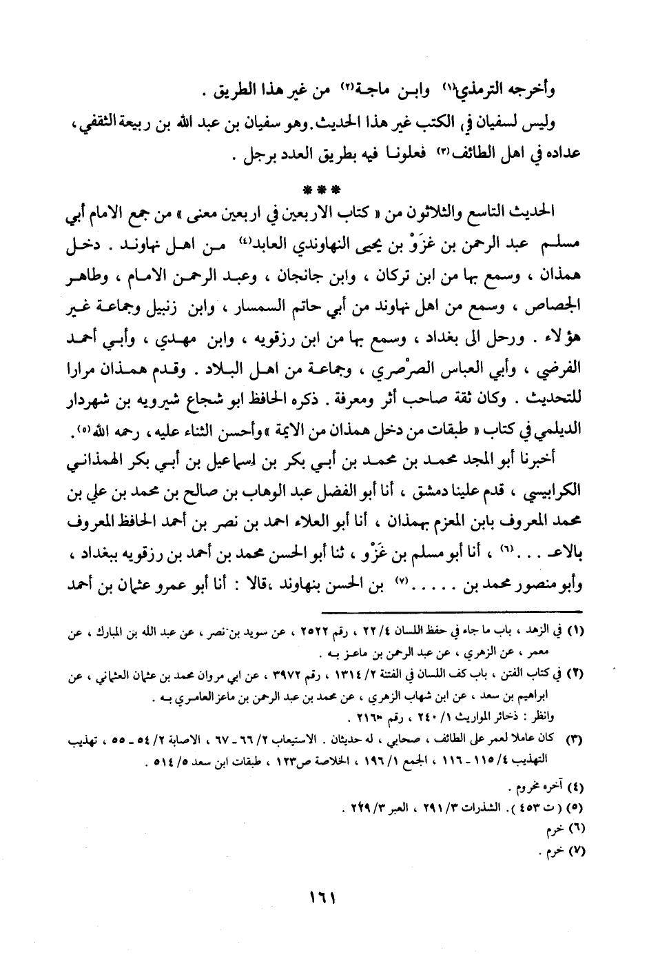 الحديث التاسع والثلاثون من ((كتاب الأربعين في أربعين معنى)) من جمع الإمام أبي مسلم عبد الرحمن بن غزو بن يحيى النهاوندي العابد من أهل نهاوند. دخل همذان، وسمع بها من ابن تركان، وابن جانجان، وعبد الرحمن الإمام، وطاهر الجصاص، وسمع من أهل نهاوند من أبي حاتم السمسار، وابن زنبيل وجماعة غير هؤلاء. ورحل إلى بغداد، وسمع بها من ابن رزقويه، وابن مهدي، وأبي أحمد الفرضي، وأبي العباس الصرصري، وجماعة من أهل البلاد. وقدم همذان مراراً للتحديث. وكان ثقة صاحب أثر ومعرفة. ذكره الحافظ أبو شجاع شيرويه بن شهردار الديلمي في كتاب ((طبقات من دخل همذان من الأيمة)) وأحسن الثناء عليه، رحمه الله.