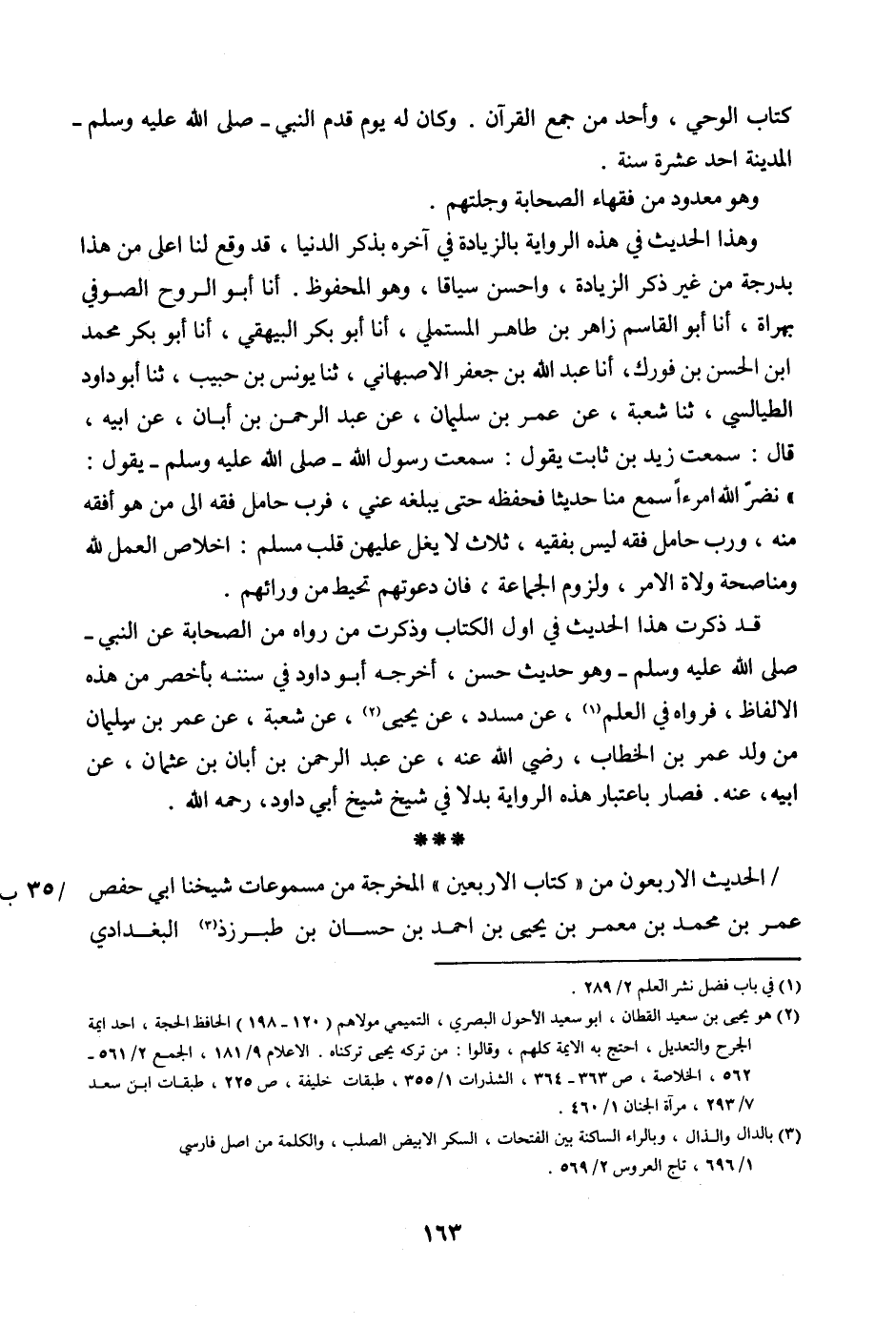قد ذكرت هذا الحديث في أول الكتاب وذكرت من رواه من الصحابة عن النبي - صلى الله عليه وسلم - وهو حديث حسن، أخرجه أبو داود في سننه بأخصر من هذه الألفاظ، فرواه في العلم، عن مسدد، عن يحيى، عن شعبة، عن عمر بن سليمان من ولد عمر بن الخطاب، رضي الله عنه، عن عبد الرحمن بن أبان بن عثمان، عن أبيه، عنه. فصار باعتبار هذه الرواية بدلاً في شيخ شيخ أبي داود، رحمه الله.