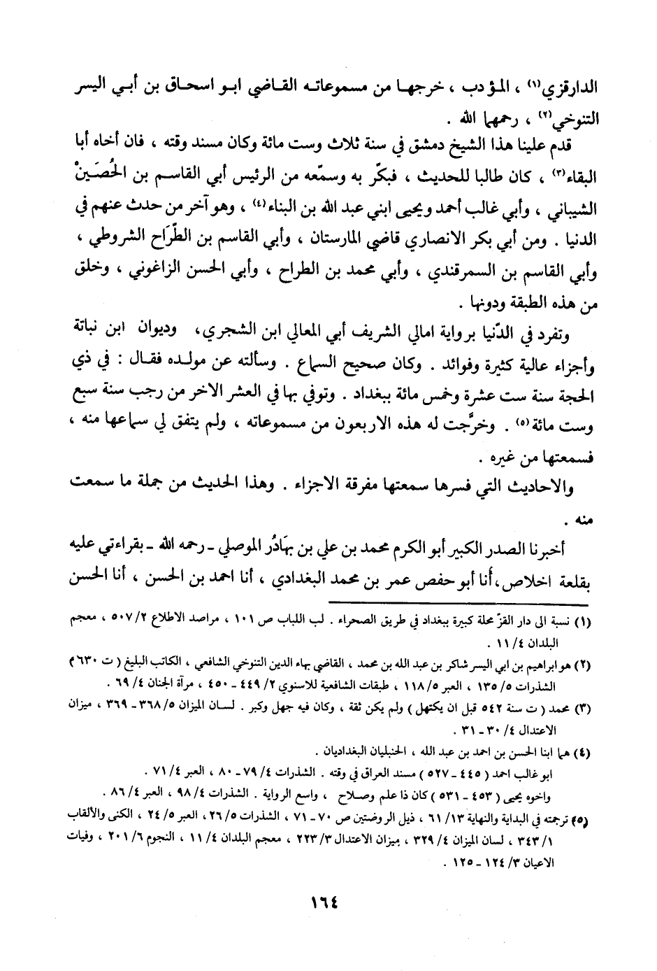 وتفرد في الدنيا برواية أمالي الشريف أبي المعالي ابن الشجري، وديوان ابن نباتة وأجزاء عالية كثيرة وفوائد. وكان صحيح السماع. وسألته عن مولده فقال: في ذي الحجة سنة ست عشرة وخمس مائة ببغداد. وتوفي بها في العشر الآخر من رجب سنة سبع وست مائة. وخرجت له هذه الأربعون من مسموعاته، ولم يتفق لي سماعها منه، فسمعتها من غيره.