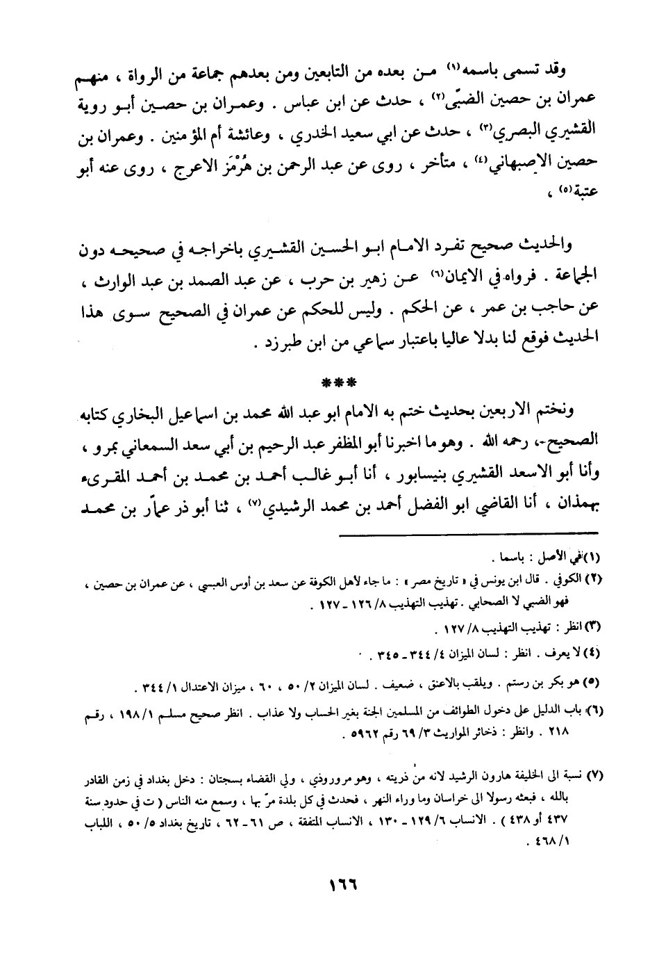 والحديث صحيح تفرد الإمام أبو الحسين القشيري بإخراجه في صحيحه دون الجماعة. فرواه في الإيمان عن زهير بن حرب، عن عبد الصمد بن عبد الوارث، عن حاجب بن عمر، عن الحكم. وليس للحكم عن عمران في الصحيح سوى هذا الحديث فوقع لنا بدلاً عالياً باعتبار سماعي من ابن طبرزد.