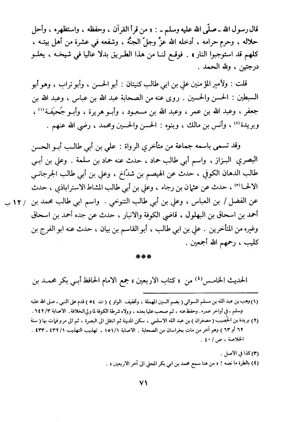 قلت: ولأمير المؤمنين علي بن أبي طالب كنيتان: أبو الحسن، وأبو تراب، وهو أبو السبطين: الحسن والحسين. روى عنه من الصحابة عبد الله بن عباس، وعبد الله بن جعفر، وعبد الله بن عمر، وعبد الله بن مسعود، وأبو هريرة، وأبو جحيفة، وبريدة، وأنس بن مالك، وبنوه: الحسن والحسين ومحمد، رضي الله عنهم.