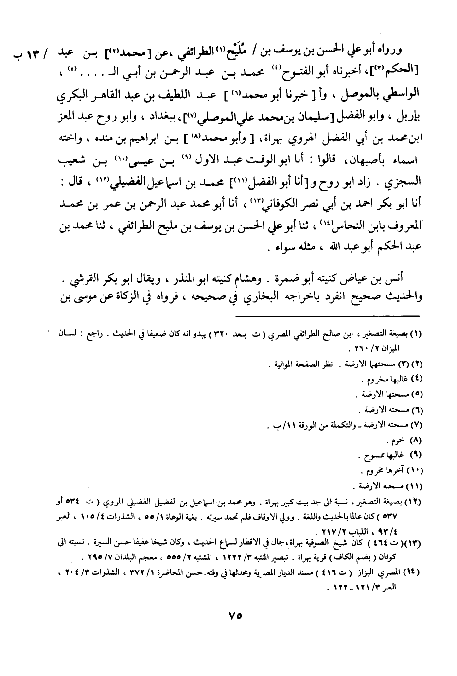 ورواه أبو علي الحسن بن يوسف بن مليح الطرائفي، عن [محمد] بن عبد [الحكم] ، أخبرناه أبو الفتوح محمد بن عبد الرحمن بن أبي الـ ... ، الواسطي بالموصل، وأ [خبرنا أبو محمد] عبد اللطيف بن عبد القاهر البكري بإربل، وأبو الفضل [سليمان بن محمد علي الموصلي] ، ببغداد، وأبو روح عبد المعز ابن محمد بن أبي الفضل الهروي بهراة، [وأبو محمد] بن إبراهيم بن منده، وأخته أسماء بأصبهان، قالوا: أنا أبو الوقت عبد الأول بن عيسى بن شعيب السجزي. زاد أبو روح و [أنا أبو الفضل] محمد بن إسماعيل الفضيلي، قال: أنا أبو بكر أحمد بن أبي نصر الكوفاني، أنا أبو محمد عبد الرحمن بن عمر بن محمد المعروف بابن النحاس، ثنا أبو علي الحسن بن يوسف بن مليح الطرائفي، ثنا محمد بن عبد الحكم أبو عبد الله، مثله سواء.