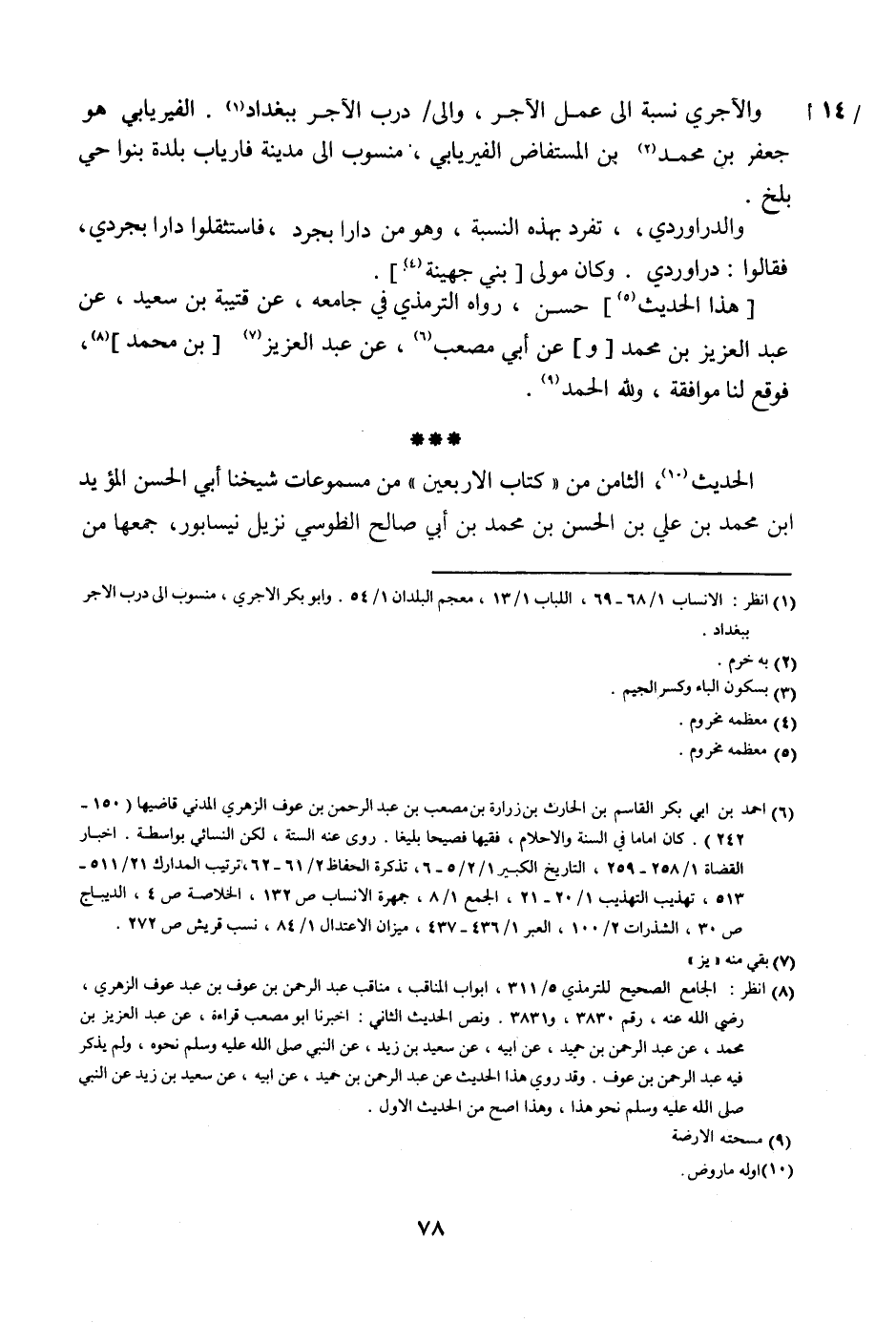 والآجري نسبة إلى عمل الآجر، وإلى درب الآجر ببغداد. الفيريابي هو جعفر بن محمد بن المستفاض الفيريابي، منسوب إلى مدينة فارياب بلدة بنواحي بلخ.