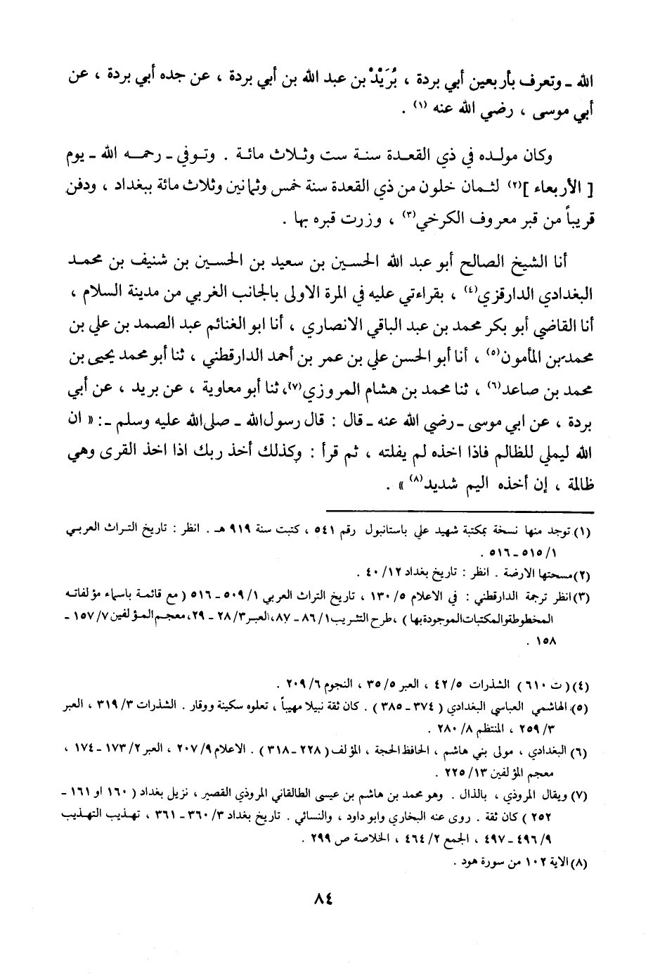 أنا الشيخ الصالح أبو عبد الله الحسين بن سعيد بن الحسين بن شنيف بن محمد البغدادي الدارقزي، بقراءتي عليه في المرة الأولى بالجانب الغربي من مدينة السلام، أنا القاضي أبو بكر محمد بن عبد الباقي الأنصاري، أنا أبو الغنائم عبد الصمد بن علي بن محمد بن المأمون، أنا أبو الحسن علي بن عمر بن أحمد الدارقطني، ثنا أبو محمد يحيى بن محمد بن صاعد، ثنا محمد بن هشام المروزي، ثنا أبو معاوية، عن بريد، عن أبي بردة، عن أبي موسى -رضي الله عنه- قال: قال رسول الله - صلى الله عليه وسلم -: ((أن الله ليملي للظالم فإذا أخذه لم يفلته، ثم قرأ: {وكذلك أخذ ربك إذا أخذ القرى وهي ظالمة إن أخذه أليم شديد} .