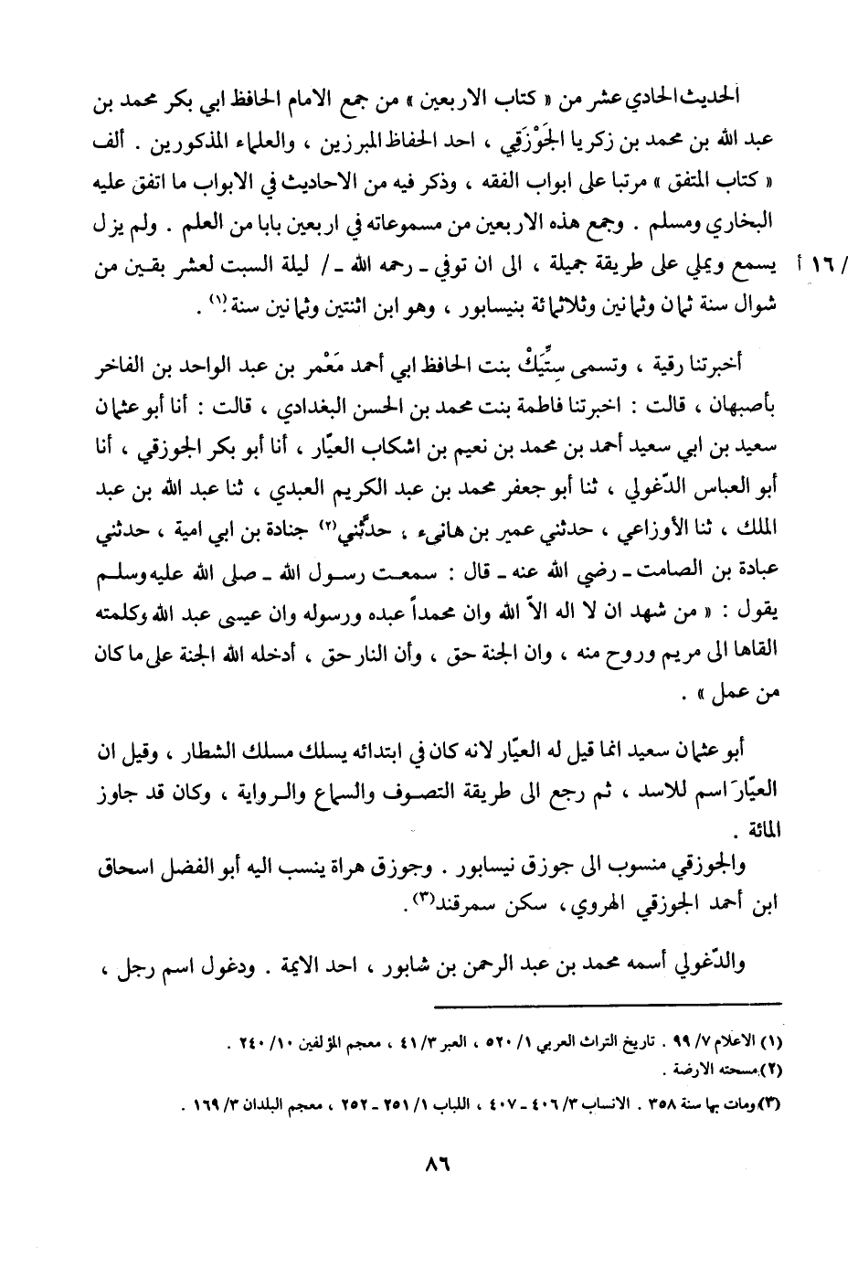أخبرتنا رقية، وتسمى ستيك بنت الحافظ أبي أحمد معمر بن عبد الواحد بن الفاخر بأصبهان، قالت: أخبرتنا فاطمة بنت محمد بن الحسن البغدادي، قالت: أنا أبو عثمان سعيد بن أبي سعيد أحمد بن محمد بن نعيم بن اشكاب العيار، أنا أبو بكر الجوزقي، أنا أبو العباس الدغولي، ثنا أبو جعفر محمد بن عبد الكريم العبدي، ثنا عبد الله بن عبد الملك، ثنا الأوزاعي، حدثني عمير بن هانئ، حدثني جنادة بن أبي أمية، حدثني عبادة بن الصامت -رضي الله عنه- قال: سمعت رسول الله - صلى الله عليه وسلم - يقول: ((من شهد أن لا إله إلا الله وأن محمداً عبده ورسوله وأن عيسى عبد الله وكلمته ألقاها إلى مريم وروح منه، وأن الجنة حق، وأن النار حق، أدخله الله الجنة على ما كان من عمل)) .