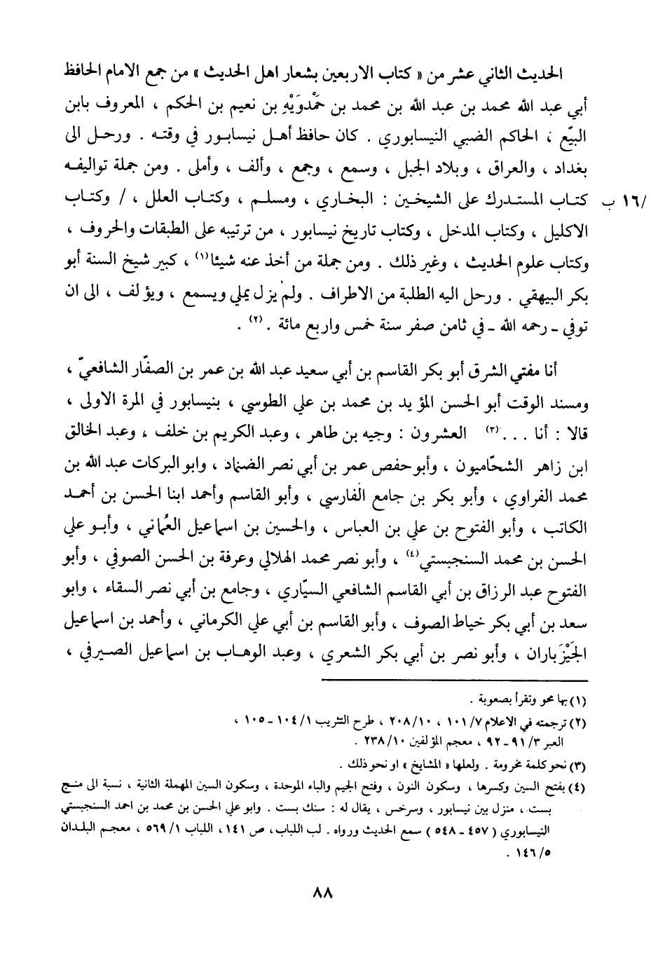 الحديث الثاني عشر من ((كتاب الأربعين بشعار أهل الحديث)) من جمع الإمام الحافظ أبي عبد الله محمد بن عبد الله بن محمد بن حمدويه بن نعيم بن الحكم، المعروف بابن البيع، الحاكم الضبي النيسابوري. كان حافظ أهل نيسابور في وقته. ورحل إلى بغداد، والعراق، وبلاد الجبل، وسمع، وجمع، وألف، وأملى. ومن جملة تواليفه كتاب المستدرك على الشيخين: البخاري، ومسلم، وكتاب العلل، وكتاب الإكليل، وكتاب المدخل، وكتاب تاريخ نيسابور، من ترتيبه على الطبقات والحروف، وكتاب علوم الحديث، وغير ذلك. ومن جملة من أخذ عنه شيئاً، كبير شيخ السنة أبو بكر البيهقي. ورحل إليه الطلبة من الأطراف. ولم يزل يملي ويسمع، ويؤلف، إلى أن توفي -رحمه الله- في ثامن صفر سنة خمس وأربع مائة.