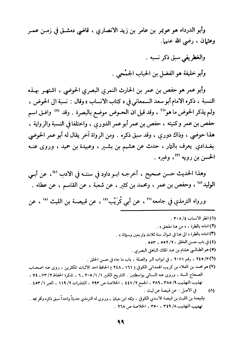 وأبو عمر هو حفص بن عمر بن الحارث النمري البصري الحوضي، اشتهر بهذه النسبة، ذكره الإمام أبو سعد السمعاني في ((كتاب الأنساب)) وقال: نسبة إلى الحوض، ولم يذكر الحوض ما هو، وقد قيل أن الحوض موضع بالبصرة. وقد وافق اسم حفص بن عمر وكنيته، حفص بن عمر أبو عمر الدوري، واختلفا في النسبة والرواية، هذا حوضي، وذاك دوري، وقد سبق ذكره. ومن الرواة آخر يقال له أبو عمر الحوضي بغدادي يعرف بالتمار، حدث عن هشيم بن بشير، وعبيدة بن حميد، وروى عنه الحسن بن رويه، وغيره.