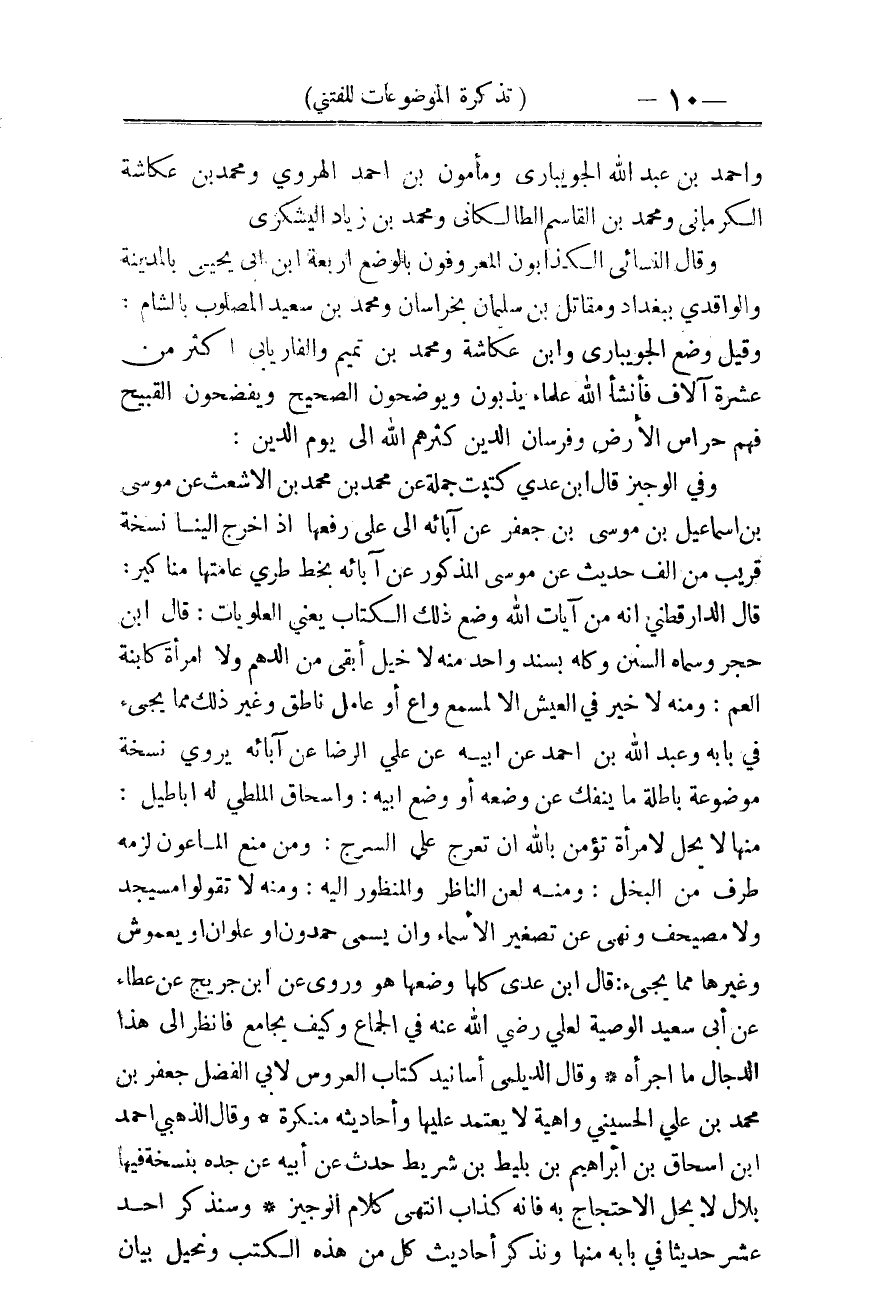 وَفِي الْوَجِيز قَالَ ابْن عدي كتبت جملَة عَن مُحَمَّد بن مُحَمَّد بن الْأَشْعَث عَن مُوسَى بن إِسْمَاعِيل بن مُوسَى بن جَعْفَر عَن آبَائِهِ إِلَى عَليّ رَفعهَا إِذْ أخرج إِلَيْنَا نُسْخَة قريب من ألف حَدِيث عَن مُوسَى الْمَذْكُور عَن آبَائِهِ بِخَط طري عامتها مَنَاكِير، قَالَ الدَّارَقُطْنِيّ إِنَّه من آيَات الله وضع ذَلِك الْكتاب يَعْنِي العلويات، قَالَ ابْن حجر وَسَماهُ السّنَن وَكله بِسَنَد وَاحِد مِنْهُ لَا خيل أبقى من الدهم وَلَا امْرَأَة كابنة الْعم، وَمِنْه لَا خير فِي الْعَيْش إِلَّا لمسمع واع أَو عَامل نَاطِق وَغير ذَلِك مِمَّا يَجِيء فِي بَابه وَعبد الله بن أَحْمد عَن أَبِيه عَن عَليّ الرِّضَا عَن آبَائِهِ يروي نُسْخَة مَوْضُوعَة بَاطِلَة مَا يَنْفَكّ عَن وَضعه أَو وضع أَبِيه، وَإِسْحَاق الْمَلْطِي لَهُ أباطيل، مِنْهَا لَا يَحِلُّ لامْرَأَةٍ تُؤْمِنُ بِاللَّهِ أَن تعرج على السرج، وَمن منع الماعون لزمَه طرف من الْبُخْل، وَمِنْه لعن النَّاظر والمنظور إِلَيْهِ، وَمِنْه لَا تَقولُوا مسيجد وَلَا مصيحف وَنهى عَن تَصْغِير الْأَسْمَاء وَأَن يُسمى حمدون أَو علوان أَو يعموش وَغَيرهَا مِمَّا يَجِيء، قَالَ ابْن عدي كلهَا وَضعهَا هُوَ ورى عَن ابْن جريج عَن عَطاء عَن أبي سعيد الْوَصِيَّة لعَلي رَضِي الله عَنهُ فِي الْجِمَاع وَكَيف يُجَامع فَانْظُر إِلَى هَذَا الدَّجَّال مَا أجرأه.
