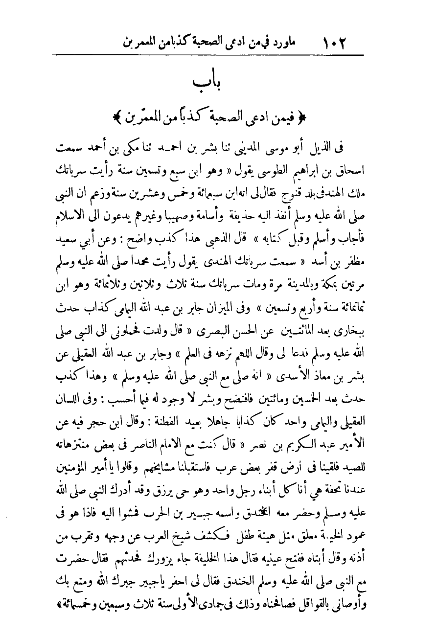 فِي الذيل أَبُو مُوسَى الْمَدِينِيّ ثَنَا مكي بن أَحْمد سَمِعت إِسْحَاق بن إِبْرَاهِيم الطوسي يَقُول «وَهُوَ ابْنُ سَبْعٍ وَتِسْعِينَ سَنَةً رَأَيْتُ سَرْبَاتِكَ مَلِكَ الْهِنْدِ فِي بَلَدِ قِنَّوْجَ فَقَالَ لِي إِنَّهُ ابْن سَبْعمِائة وَخمْس وَعشْرين سَنَةً وَزَعَمَ أَنَّ النَّبِيَّ صَلَّى اللَّهُ عَلَيْهِ وَسَلَّمَ أَنْفَذَ إِلَيْهِ حُذَيْفَةَ وَأُسَامَةَ وَصُهَيْبًا وَغَيْرَهُمْ يَدْعُونَ إِلَى الإِسْلامِ فَأَجَابَ وَأَسْلَمَ وَقَبِلَ كِتَابه» قَالَ الذَّهَبِيّ هَذَا كذب وَاضح، وَعَن أبي سعيد مظفر بن أَسد «سَمِعْتُ سَرْبَاتِكَ الْهِنْدِيَّ يَقُولُ رَأَيْتُ مُحَمَّدًا صَلَّى اللَّهُ عَلَيْهِ وَسَلَّمَ مَرَّتَيْنِ بِمَكَّةَ وَالْمَدِينَةَ مَرَّةً وَمَاتَ سرباتك سنة ثَلَاث وَثَلَاثِينَ وثلاثمائة وَهُوَ ابْن ثَمَانمِائَة سنة وَأَرْبع وَتِسْعين» وَفِي الْمِيزَان جَابر بن عبد الله اليمامي كَذَّاب حدث ببخارى بعد الْمِائَتَيْنِ عَن الْحسن الْبَصْرِيّ «قَالَ وُلِدْتُ فَحَمَلُونِي إِلَى النَّبِيِّ صَلَّى اللَّهُ عَلَيْهِ وَسَلَّمَ فَدَعَا لِي وَقَالَ اللَّهُمَّ نَزِّهْهُ فِي الْعلم» وَجَابِر بن عبد الله الْعقيلِيّ عَن بشر بن معَاذ الْأَسدي «أَنه صلى مَعَ النَّبِيِّ صَلَّى اللَّهُ عَلَيْهِ وَسَلَّمَ» وَهَذَا كذب حدث بعد الْخمسين وَمِائَتَيْنِ فافتضح وَبشر لَا وجود لَهُ فِيمَا أَحسب، وَفِي اللِّسَان الْعقيلِيّ واليمامي وَاحِد كَانَ كذابا جَاهِلا بعيد الفطنة: