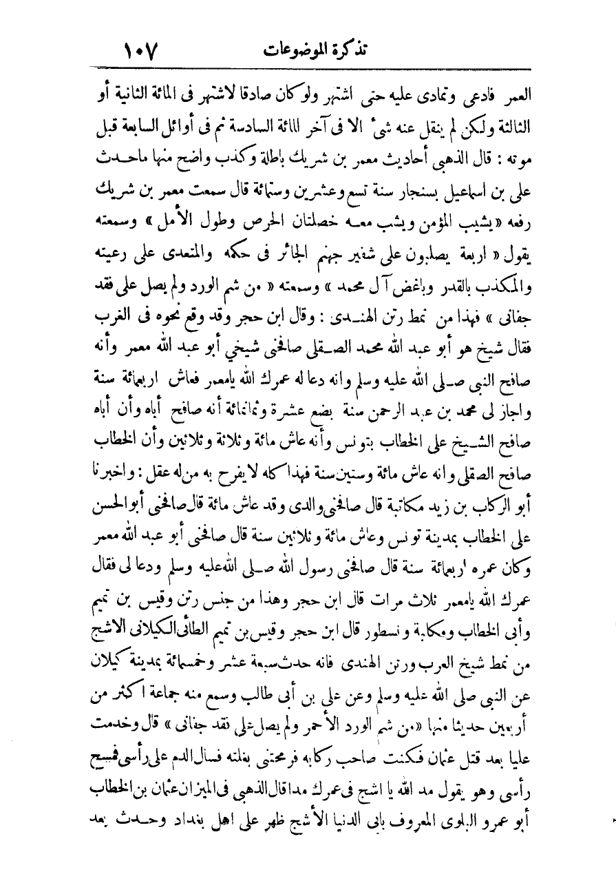 وَأخْبرنَا أَبُو الركاب بن زيد مُكَاتبَة قَالَ صَافَحَنِي وَالِدي وَقد عَاشَ مائَة قَالَ صَافَحَنِي أَبُو الْحسن عَليّ الْخطاب بِمَدِينَة تونس وعاش مائَة وَثَلَاثِينَ سنة قَالَ صَافَحَنِي أَبُو عبد الله معمر وَكَانَ عمره أَرْبَعمِائَة سنة قَالَ صَافَحَنِي رَسُولُ اللَّهِ صَلَّى اللَّهُ عَلَيْهِ وَسلم ودعا لي فَقَالَ عمرك الله يَا معمر ثَلَاث مَرَّات قَالَ ابْن حجر وَهَذَا من جنس رتن وَقيس بن تَمِيم وَأبي الْخطاب ومكلبة ونسطور قَالَ ابْن حجر وَقيس بن تَمِيم الطَّائِي الكيلاني الْأَشَج من نمط شيخ الْعَرَب ورتن الْهِنْدِيّ فَإِنَّهُ حدث سَبْعَة عشر وَخَمْسمِائة بِمَدِينَة كيلان عَن النَّبِيِّ صَلَّى اللَّهُ عَلَيْهِ وَسَلَّمَ وَعَن عَليّ بن أبي طَالب وَسمع مِنْهُ جمَاعَة أَكثر من أَرْبَعِينَ حَدِيثا مِنْهَا «من شم الْورْد الْأَحْمَر وَلم يُصَلِّي عَليّ فقد جفاني» قَالَ وخدمت عليا بعد قتل عُثْمَان فَكنت صَاحب ركابه فرمحتني بغلته فَسَالَ الدَّم على رَأْسِي فَمسح رَأْسِي وَهُوَ يَقُول مد الله يَا أشج فِي عمرك مدا قَالَ الذَّهَبِيّ فِي الْمِيزَان عُثْمَان بن الْخطاب أَبُو عَمْرو البلوي الْمَعْرُوف بِأبي الدُّنْيَا الْأَشَج ظهر على أهل بَغْدَاد وَحدث بعد