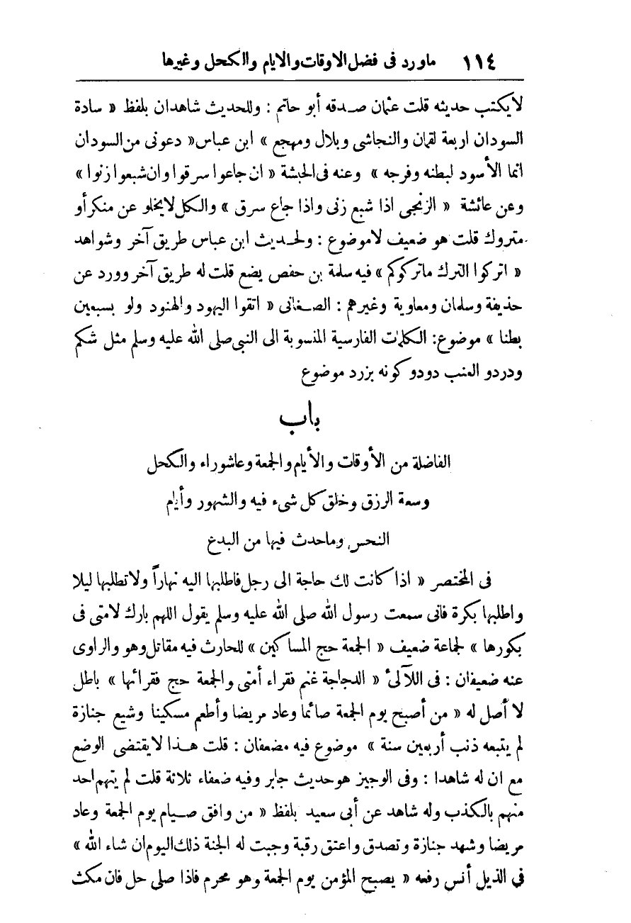 بَابُ الْفَاضِلَةِ مِنَ الأَوْقَاتِ وَالأَيَّامِ وَالْجُمُعَة وعاشوراء والكحل وسعة الرزق وَخلق كل شَيْء فِيهِ والشهور وَأَيَّام النحس وَمَا حدث فِيهَا من الْبدع.