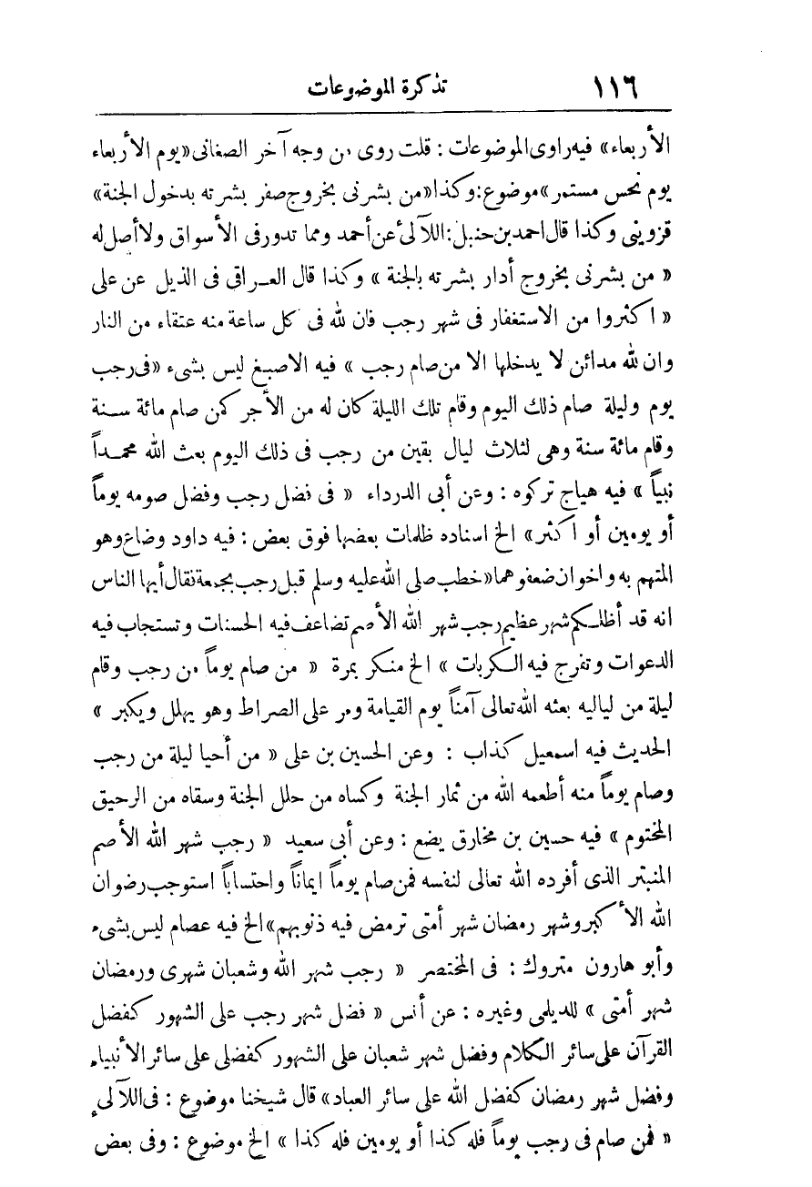 وَفِي بعض -[117]- الرسائل لعَلي بن إِبْرَاهِيم الْعَطَّار اعْلَم أَن الْعلمَاء أَجمعُوا على أَن رَمَضَان أفضل الشُّهُور وَذَا الْحجَّة وَالْمحرم أفضل من رَجَب بل لَو قيل ذُو الْقعدَة أفضل من رَجَب لَكَانَ سائغا لِأَنَّهُ من الْأَشْهر الْحرم وَلَا شَيْء يتَصَوَّر فِي رَجَب من الْفَضَائِل سوى مَا قيل من الْإِسْرَاء وَلم يثبت ذَلِك وَمَا رُوِيَ فِي فضل صِيَام رَجَب وَشَعْبَان أَو تَضْعِيف الْجَزَاء على صيامهما فكله مَوْضُوع أَو ضَعِيف لَا أصل لَهُ، وَكَذَا مَا أخرج العساكري والكتاني فِي الصّيام والتضعيف مَوْضُوع لَا يحْتَج بِهِ أصلا، وَكَانَ عبد الله الْأنْصَارِيّ لَا يَصُوم رجبا وَينْهى عَنهُ وَيَقُول لم يَصح عَن النَّبِيِّ صَلَّى اللَّهُ عَلَيْهِ وَسَلَّمَ فِي ذَلِك شَيْء، وَمَا رُوِيَ من كَثْرَة صِيَام شعْبَان فَلِأَنَّهُ رُبمَا كَانَ يَصُوم ثَلَاثَة من كل شهر ويشتغل عَنْهَا فِي بعض الشُّهُور فيتداركه فِي شعْبَان أَو لغير ذَلِك وَمِمَّا يفعل فِي هَذِه الْأَزْمَان إِخْرَاج الزَّكَاة فِي رَجَب دون غَيره لَا أصل لَهُ، وَكَذَا كَثْرَة اعتمار أهل مَكَّة فِي رَجَب لَا أصل لَهُ فِي علمي وَإِنَّمَا الحَدِيث «عمْرَة فِي رَمَضَان تعدل حجَّة» وَمِمَّا أحدث الْعَوام صِيَام أول خَمِيس من رَجَب وَلَعَلَّه يكون آخر يَوْم من الجمادى وَكله بِدعَة، وَمِمَّا أَحْدَثُوا فِي رَجَب وَشَعْبَان إقبالهم على الطَّاعَة أَكثر وإعراضهم فِي غَيرهَا حَتَّى كَأَنَّهُمْ لم يخاطبوا إِلَّا فيهمَا.