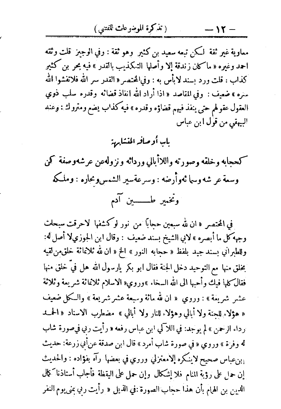 بَاب أَوْصَافه المتشابهة كحجابه وخلقه وَصورته واللا أُبَالِي وردائه ونزوله عَن عَرْشه وَصفَة كن وسعة عَرْشه وسمائه وأرضه وَسُرْعَة سير الشَّمْس وبحاره وَملكه وتخمير طين آدم.