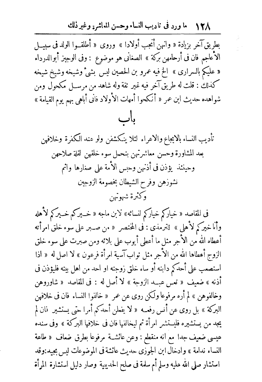 فِي الْمَقَاصِد «شَاوِرُوهُمْ وَخَالِفُوهُنَّ» لَمْ أَرَهْ مَرْفُوعًا وَلَكِن رُوِيَ عَن عمر «خَالِفُوا النِّسَاءَ فَإِنَّ فِي خِلافِهِمُ الْبركَة» بل رُوِيَ عَن أنس رَفعه «لَا يَفْعَلَنَّ أَحَدُكُمْ أَمْرًا حَتَّى يَسْتَشِيرَ فَإِنْ لَمْ يَجِدْ مَنْ يَسْتَشِيرُهُ فَلْيَسْتَشِرِ امْرَأَةً ثُمَّ لِيُخَالِفْهَا فَإِن فِي خلَافهَا الْبركَة» وَفِي سَنَده عِيسَى ضَعِيف جدا مَعَ أَنه مُنْقَطع، وَعَن عَائِشَة مَرْفُوعَة بطرق ضِعَاف «طَاعَة النِّسَاء ندامة» وَإِدْخَال ابْن الْجَوْزِيّ حَدِيث عَائِشَة فِي الموضوعات لَيْسَ بجيد، وَقد اسْتَشَارَ صلى الله عَلَيْهِ وَسلم أم سَلمَة فِي صلح الْحُدَيْبِيَة وَصَارَ دَلِيل استشارة الْمَرْأَة -[129]- الفاضلة وَقد استدرك عَلَيْهِ ابْنة شُعَيْب فِي أَمر مُوسَى على نَبينَا وَعَلَيْهِمَا الصَّلَاة وَالسَّلَام فِي آخَرين. فِي الذيل «لَا يفعلن أحدكُم» إِلَخ. فِيهِ مُنكر الحَدِيث: الصغاني حَدِيث عَائِشَة مَوْضُوع. اللآلئ حَدِيثهَا لَا يَصح قلت لَهُ طرقا وشواهد مِنْهَا «عَوِّدُوا النِّسَاءَ لآفَاتِهَا حَقِيقَةً إِنْ أَطَعْتَهَا أَهْلَكَتْكَ وَخَالِفُوا النِّسَاءَ فَإِنَّ فِي خلافهن الْبركَة» لَوْلا النِّسَاءُ لَعُبِدَ اللَّهَ حَقًّا «لَا أصل لَهُ. قلت لَهُ شَاهد بِسَنَد فِيهِ مَتْرُوك بِلَفْظ» لَوْلا الْمَرْأَةُ لَدَخَلَ الرَّجُلُ الْجَنَّةَ".