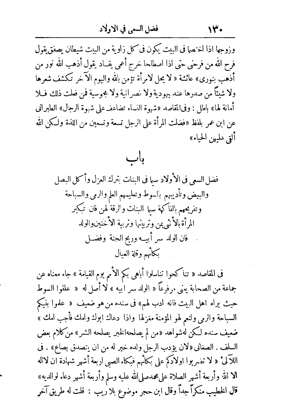 بَابُ فَضْلِ السَّعْيِ فِي الأَوْلادِ سِيَّمَا فِي الْبَنَاتِ بِتَرْكِ الْعَزْلِ وَأكل البصل وَالْبيض وتأديبهم بِالسَّوْطِ وتعليمهم الْعلم وَالرَّمْي والسباحة وتفريحهم بالفاكهة سِيمَا الْبَنَات والرقة لَهُنَّ فَإِن تبكير الْمَرْأَة بِالْأُنْثَى يمن وتربيتها وتربية الْأُخْتَيْنِ وَالْولد فَإِن الْوَلَد سر أَبِيه وريح الْجنَّة وَفضل بكائهم وَقلة الْعِيَال.