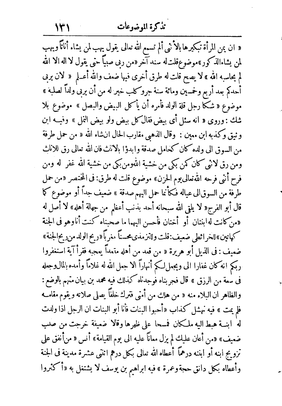وَقَالَ الذَّهَبِيّ مقارب الْحَال إِن شَاءَ الله «مَنْ حَمَلَ طُرْفَةً مِنَ السُّوقِ إِلَى وَلَدِهِ كَانَ كَحَامِلِ صَدَقَةٍ وابدؤوا بالإناث فَإِن الله تَعَالَى رَقَّ لِلإِنَاثِ وَمَنْ رَقَّ لأُنْثَى كَانَ كَمَنْ بَكَى مِنْ خَشْيَةِ اللَّهِ وَمَنْ بَكَى مِنْ خَشْيَةِ اللَّهِ غُفِرَ لَهُ وَمَنْ فَرَّحَ أُنْثَى فَرَّحَهُ اللَّهُ تَعَالَى يَوْمَ الْحزن» مَوْضُوع قلت لَهُ طرق.