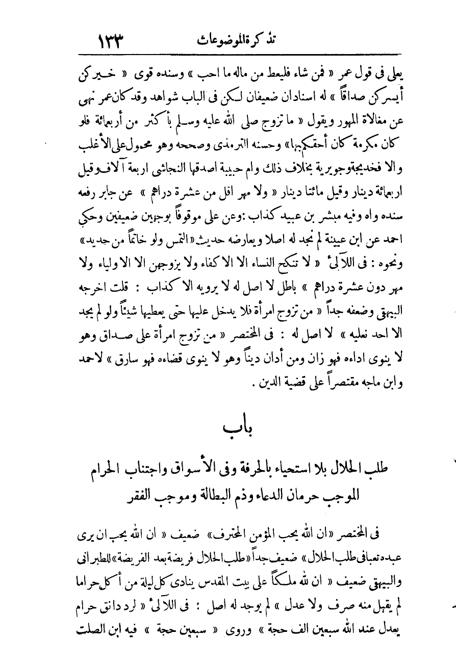 فِي اللآلئ «لَا تُنْكَحُ النِّسَاءُ إِلا الأَكْفَاءَ وَلا يُزَوِّجُهُنَّ إِلا الأَوْلِيَاءُ وَلا مَهْرَ دُونَ عَشْرَةِ دَرَاهِمَ» بَاطِلٌ لَا أصل لَهُ لَا يرويهِ إِلَّا كَذَّاب: قلت أخرجه الْبَيْهَقِيّ وَضَعفه جدا.