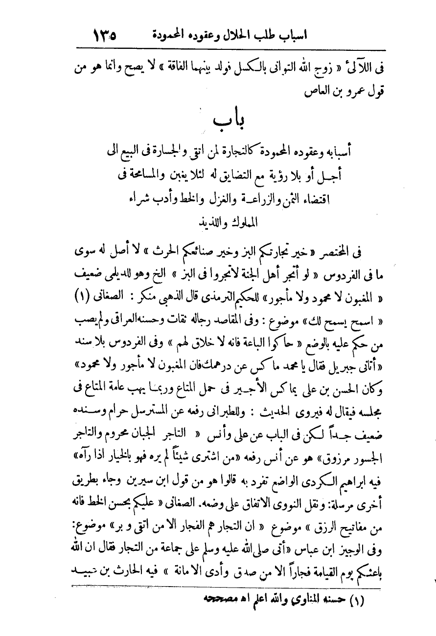 وَفِي الْوَجِيز ابْن عَبَّاس «أَتَى صَلَّى اللَّهُ عَلَيْهِ وَسَلَّمَ عَلَى جَمَاعَةٍ مِنَ التُّجَّارِ فَقَالَ إِنَّ اللَّهَ بَاعِثُكُمْ يَوْمَ الْقِيَامَةِ فُجَّارًا إِلا مَنْ صَدَّقَ وَأَدَّى الْأَمَانَة» فِيهِ الْحَارِث بن عبيد -[136]- ضَعِيف، وَرُوِيَ عَن أنس وَفِيه أَبُو الجهم مَتْرُوك قلت صَححهُ التِّرْمِذِيّ وَالْحَاكِم وَأحمد زِيَادَة «إِنَّهُمْ قَالُوا يَا رَسُولَ اللَّهِ أَلَيْسَ قَدْ أَحَلَّ اللَّهُ الْبَيْعَ قَالَ بَلَى وَلَكِنَّهُمْ يَحْلِفُونَ فَيَأْثَمُونَ ويحدثون فيكذبون» وَفِي اللآلئ قَالَ ابْن حبَان لَيْسَ لَهُ أصل يرجع إِلَيْهِ وَفِيه الْحَارِث: روى لَهُ مُسلم وَغَيره والْحَدِيث صَحِيح رُوِيَ عَن عدَّة طرق وَصَححهُ جمَاعَة.