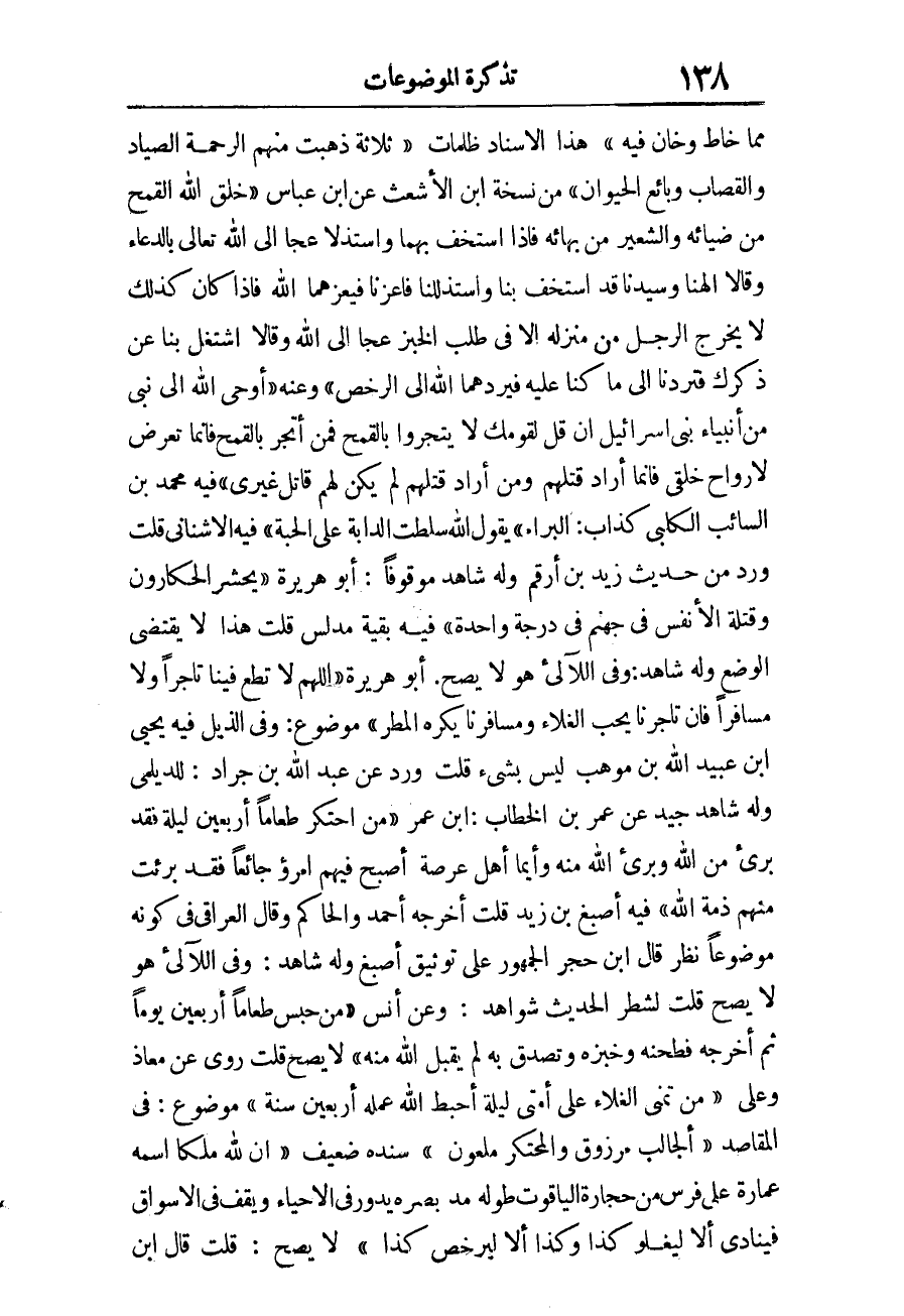 ابْن عمر «مَنِ احْتَكَرَ طَعَامًا أَرْبَعِينَ لَيْلَةً فَقَدْ بَرِئَ مِنَ اللَّهِ وَبَرِئَ اللَّهُ مِنْهُ وَأَيُّمَا أَهْلُ عَرْصَةٍ أَصْبَحَ فِيهِمُ امْرُؤٌ جَائِعًا فَقَدْ بَرِئت مِنْهُم ذمَّة الله» فِيهِ اصبغ بن زيد قلت أخرجه أَحْمد وَالْحَاكِم وَقَالَ الْعِرَاقِيّ فِي كَونه مَوْضُوعا نظر قَالَ ابْن حجر الْجُمْهُور على تَوْثِيق أصبغ وَله شَاهد، وَفِي اللآلئ هُوَ لَا يَصح قلت لشطر الحَدِيث شَوَاهِد، وَعَن أنس «مَنْ حَبَسَ طَعَامًا أَرْبَعِينَ يَوْمًا ثُمَّ أَخْرَجَهُ فَطَحَنَهُ وَخَبَزَهُ وَتَصَدَّقَ بِهِ لَمْ يَقْبَلِ اللَّهُ مِنْهُ» لَا يَصح قلت رُوِيَ عَن معَاذ وَعلي «مَنْ تَمَنَّى الْغَلاءَ عَلَى أُمَّتِي لَيْلَةً أَحْبَطَ اللَّهُ عَمَلَهُ أَرْبَعِينَ سنة» مَوْضُوع.