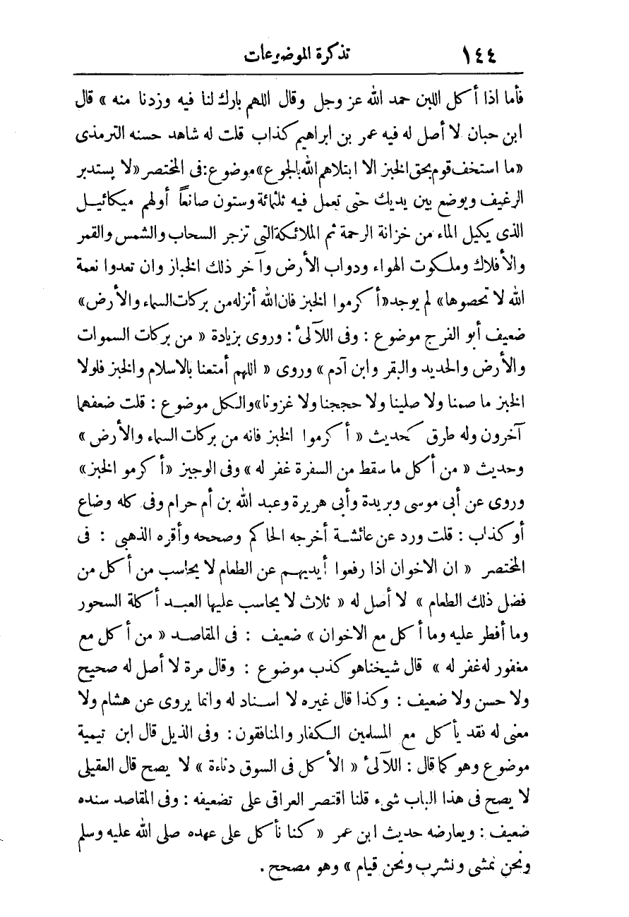 «أَكْرِمُوا الْخُبْزَ فَإِنَّ اللَّهَ أَنْزَلَهُ مِنْ بَرَكَاتِ السَّمَاءِ وَالأَرْضِ» ضَعِيفٌ أَبُو الْفرج مَوْضُوع، وَفِي اللآلئ، وَرُوِيَ بِزِيَادَة «من بَرَكَات السَّمَوَات وَالْأَرْض وَالْحَدِيد وَالْبَقر وَابْن آدم» وَرُوِيَ «اللَّهُمَّ أَمْتِعْنَا بِالإِسْلامِ وَالْخُبْزِ فَلَوْلا الْخُبْزُ مَا صُمْنَا وَلا صَلَّيْنَا وَلَا حجَجنَا وَلَا غزونا» وَالْكل مَوْضُوع: قلت ضعفهما آخَرُونَ وَله طرق كَحَدِيث «أَكْرِمُوا الْخُبْزَ فَإِنَّهُ مِنْ بَرَكَاتِ السَّمَاء وَالْأَرْض» وَحَدِيث «مَنْ أَكَلَ مَا سَقَطَ مِنَ السفرة غفر لَهُ» وَفِي الْوَجِيز «أكْرمُوا الْخبز» وَرُوِيَ عَن أبي مُوسَى وَبُرَيْدَة وَأبي هُرَيْرَة وَعبد الله بن أم حرَام وَفِي كُله وَضاع أَو كَذَّاب: قلت ورد عَن عَائِشَة أخرجه الْحَاكِم وَصَححهُ وَأقرهُ الذَّهَبِيّ.