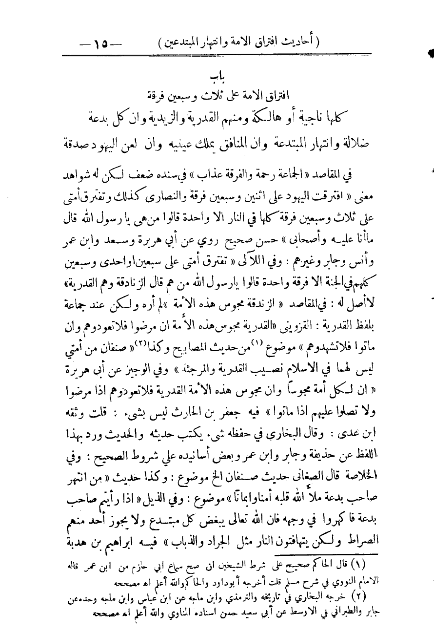 بَابُ افْتِرَاقِ الأُمَّةِ عَلَى ثَلاثٍ وَسَبْعِينَ فِرْقَةً كُلُّهَا نَاجِيَةٌ أَوْ هالكة وَمِنْهُم الْقَدَرِيَّة والزيدية وَإِن كل بِدعَة ضَلَالَة وانتهار المبتدعة وَإِن الْمُنَافِق يملك عَيْنَيْهِ وَإِن لعن الْيَهُود صَدَقَة.