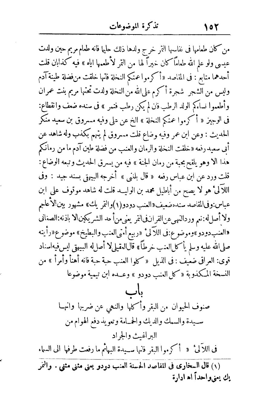 فِي الْوَجِيز «أكْرمُوا عمتكم النَّخْلَة» إِلَخ. عَن عَليّ وَفِيه مَسْرُوق بن سعيد مُنكر الحَدِيث، وَعَن ابْن عمر وَفِيه وَضاع قلت مَسْرُوق لم يتهم بكذب وَله شَاهد عَن أبي سعيد رَفعه «خلقت النَّخْلَة وَالرُّمَّان وَالْعِنَب من فضلَة طين آدم مَا من رمانكم هَذَا إِلَّا وَهُوَ يلقح بِحَبَّة من رمان الْجنَّة» فِيهِ من يسرق الحَدِيث وَتَبعهُ الوضاع: قلت ورد عَن ابْن عَبَّاس رَفعه «قَالَ بَلغنِي» أخرجه الْبَيْهَقِيّ بِسَنَد جيد، وَفِي اللآلئ هُوَ لَا يَصح من أباطيل مُحَمَّد بن الْوَلِيد قلت لَهُ شَاهد مَوْقُوف على ابْن عَبَّاس.