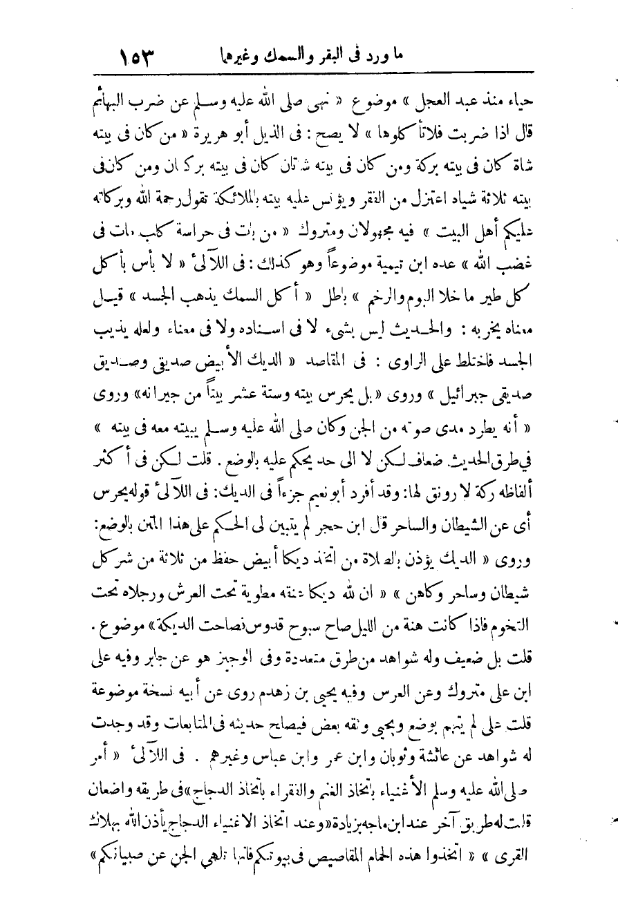 فِي الْمَقَاصِد «الدِّيكُ الأَبْيَضُ صَدِيقِي وَصَدِيقُ صَدِيقِي جِبْرِيل» وَرُوِيَ «بل يحرس بَيته وَسِتَّة عشر بَيْتا من جِيرَانه» وَرُوِيَ «أَنه يطرد مدى صَوته من الْجِنّ وَكَانَ صلى الله عَلَيْهِ وَسلم يبيته مَعَه فِي بَيته» فِي طرق الحَدِيث ضِعَاف لَكِن لَا إِلَى حد يحكم عَلَيْهِ بِالْوَضْعِ. قلت لَكِن فِي أَكثر أَلْفَاظه ركة لَا رونق لَهَا، وَقد أفرد أَبُو نعيم جُزْءا فِي الديك: فِي اللآلئ قَوْله يحرس أَي عَن الشَّيْطَان والساحر قَالَ ابْن حجر لم يتَبَيَّن لي الحكم على هَذَا الْمَتْن بِالْوَضْعِ، وَرُوِيَ «الدِّيكُ يُؤَذِّنُ بِالصَّلاةِ مَنِ اتَّخَذَ دِيكًا أَبْيَضَ حُفِظَ مِنْ ثَلاثَةٍ مِنْ شَرِّ كُلِّ شَيْطَانٍ وَسَاحِرٍ وكاهن» إِنَّ لِلَّهِ دِيكًا عُنُقُهُ مَطْوِيَّةٌ تَحْتَ الْعَرْشِ وَرِجْلاهُ تَحْتَ التُّخُومِ فَإِذَا كَانَتْ هَنَةٌ مِنَ اللَّيْلِ صَاحَ سُبُّوحٌ قُدُّوسٌ فَصَاحَتِ الدِّيَكَةُ" مَوْضُوع. قلت بل ضَعِيف وَله شَوَاهِد من طرق مُتعَدِّدَة وَفِي الْوَجِيز هُوَ عَن جَابر وَفِيه عَليّ بن عَليّ مَتْرُوك وَعَن الْعرس وَفِيه يحيى بن زَهْدَم روى عَن أَبِيه نُسْخَة مَوْضُوعَة قلت عَليّ لم يتهم بِوَضْع وَيحيى وَثَّقَهُ بعض فيصلح حَدِيثه فِي المتابعات وَقد وجدت لَهُ شَوَاهِد عَن عَائِشَة وثوبان وَابْن عمر وَابْن عَبَّاس وَغَيرهم.