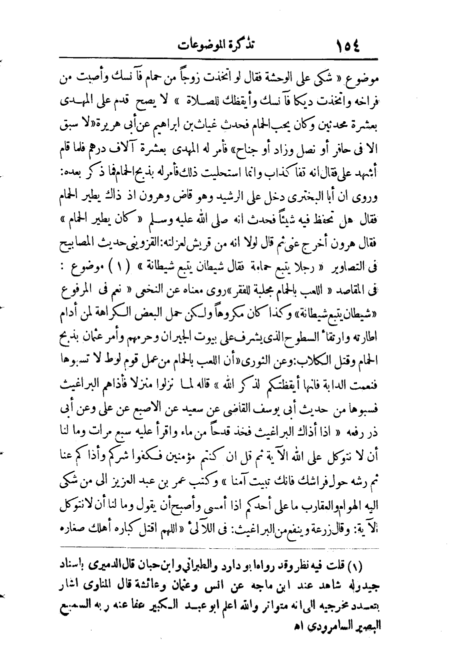 «شَكَى عَلِيٌّ الْوَحْشَةَ فَقَالَ لَوِ اتَّخَذْتَ زَوْجًا مِنْ حَمَامٍ فَآنَسَكَ وَأَصَبْتَ مِنْ فِرَاخِهِ وَاتَّخَذْتَ دِيكًا فَآنَسَكَ وَأَيْقَظَكَ لِلصَّلاةِ» لَا يَصِحُّ قدم على الْمهْدي بِعشْرَة محدثين وَكَانَ يحب الْحمام فَحدث غياث بن إِبْرَاهِيم عَن أبي هُرَيْرَة «لَا سبق إِلَّا فِي حافر أَو نصل وَزَاد أَو جنَاح» فَأمر لَهُ الْمهْدي بِعشْرَة آلَاف دِرْهَم فَلَمَّا قَامَ أشهد عَليّ فَقَالَ أَنه قفا كَذَّاب وَإِنَّمَا استحليت ذَلِك فَأمر لَهُ بِذبح الْحمام فَمَا ذكر بعده، وَرُوِيَ أَن أَبَا البحتري دخل على الرشيد وَهُوَ قَاض وَهَارُون إِذْ ذَاك يطير الْحمام فَقَالَ هَل تحفظ فِيهِ شَيْئا فَحدث أَنَّهُ صَلَّى اللَّهُ عَلَيْهِ وَسَلَّمَ «كَانَ يطير الْحمام» فَقَالَ هَارُون أخرج عني ثمَّ قَالَ لَوْلَا أَنه من قُرَيْش لعزلته.