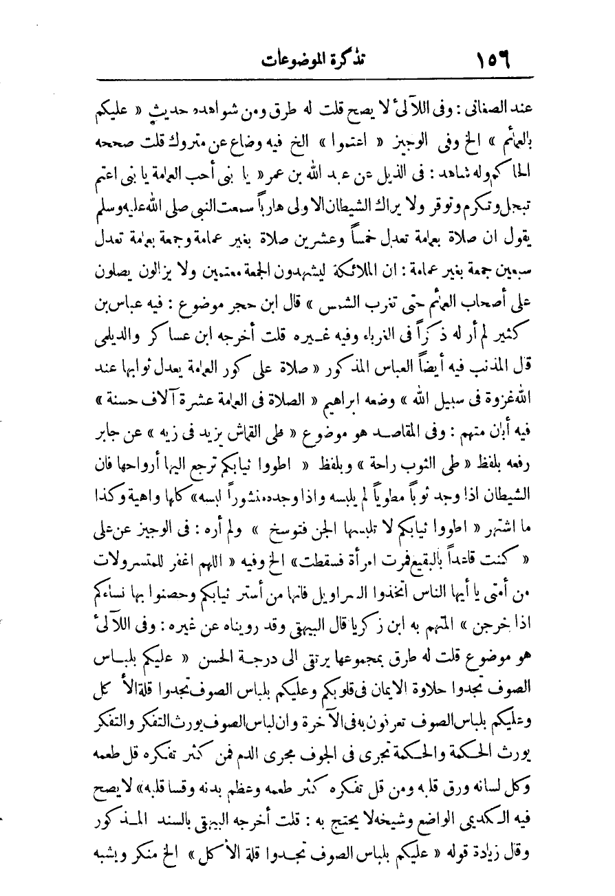 فِي الذيل عَن عبد الله بن عمر «يَا نَبِي أحب الْعِمَامَة يَا نَبِي اعتم تبجل وتكرم وتوقر وَلا يَرَاكَ الشَّيْطَانُ إِلا وَلَّى هَارِبًا سَمِعْتُ النَّبِيَّ صَلَّى اللَّهُ عَلَيْهِ وَسَلَّمَ يَقُولُ إِنَّ صَلاةً بِعِمَامَةٍ تَعْدِلُ خَمْسًا وَعِشْرِينَ صَلاةً بِغَيْرِ عِمَامَةٍ وَجُمُعَةٌ بِعِمَامَةٍ تَعْدِلُ سَبْعِينَ جُمُعَةٍ بِغَيْرِ عِمَامَةٍ» إِنَّ الْمَلائِكَةَ لَيَشْهَدُونَ الْجُمُعَةَ مُعْتَمِّينَ وَلا يَزَالُونَ يُصَلُّونَ عَلَى أَصْحَابِ الْعَمَائِمِ حَتَّى تغرب الشَّمْس" قَالَ ابْن حجر مَوْضُوع: فِيهِ عَبَّاس بن كثير لم أر لَهُ ذكرا فِي الغرباء وَفِيه غَيره قلت أخرجه ابْن عَسَاكِر والديلمي قَالَ المذنب فِيهِ أَيْضا الْعَبَّاس الْمَذْكُور.