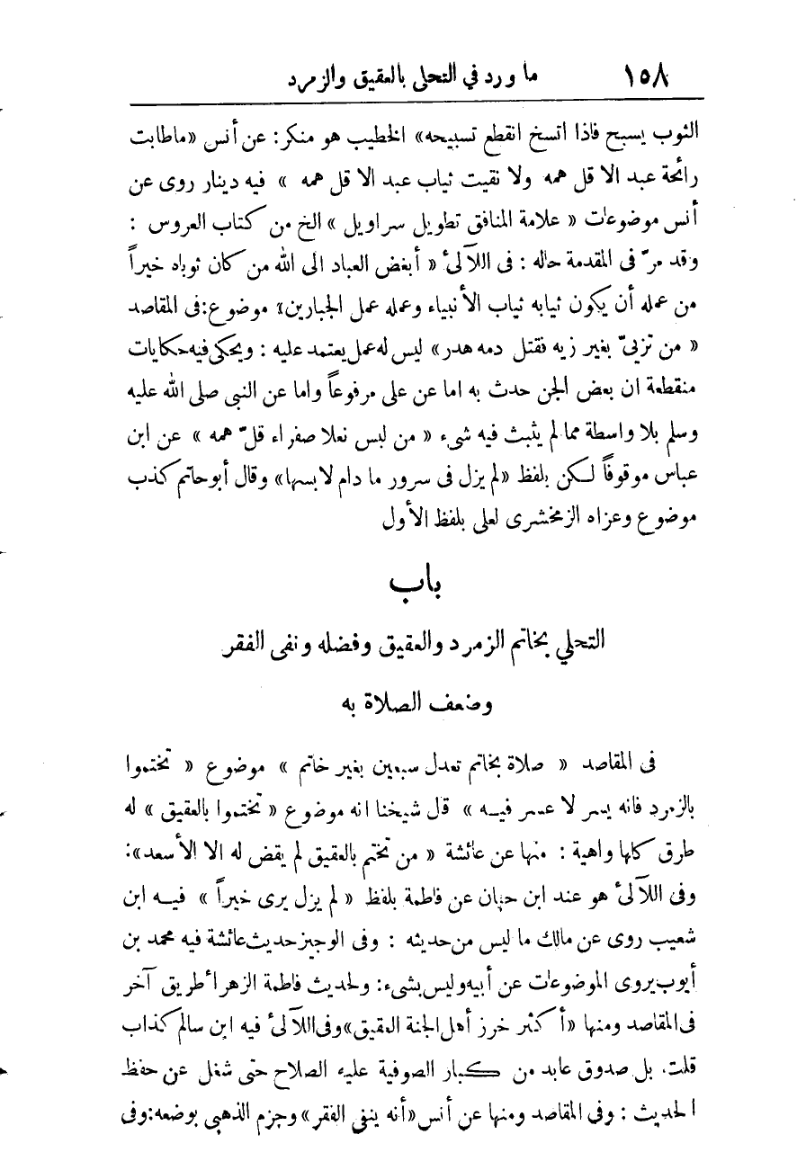 «تَخَتَّمُوا بِالْعَقِيقِ» لَهُ طُرُقٌ كُلُّهَا واهية: مِنْهَا عَن عَائِشَة «من تختم بالعقيق لم يقْض لَهُ إِلَّا الأسعد» ، وَفِي اللآلئ هُوَ عِنْد ابْن حبَان عَن فَاطِمَة بِلَفْظ «لم يزل يرى خيرا» فِيهِ ابْن شُعَيْب روى عَن مَالك مَا لَيْسَ من حَدِيثه، وَفِي الْوَجِيز حَدِيث عَائِشَة فِيهِ مُحَمَّد بن أَيُّوب يروي الموضوعات عَن أَبِيه وَلَيْسَ بِشَيْء، وَلِحَدِيث فَاطِمَة الزهراء طَرِيق آخر فِي الْمَقَاصِد وَمِنْهَا «أَكثر خرز الْجنَّة العقيق» وَفِي اللآلئ فِيهِ ابْن سَالم كَذَّاب قلت بل صَدُوق عَابِد من كبار الصُّوفِيَّة عَلَيْهِ الصّلاح حَتَّى شغل عَن حفظ الحَدِيث، وَفِي الْمَقَاصِد وَمِنْهَا عَن أنس «أَنه يَنْفِي الْفقر» وَجزم الذَّهَبِيّ بِوَضْعِهِ، وَفِي -[159]- اللآلئ وَقَالَ ابْن عدي هُوَ بَاطِل، وَفِي الْمَقَاصِد وَمِنْهَا «من نقش فِيهِ وَمَا توفيقي إِلَّا بِاللَّه وفْق لكل خير» وَفِيه كَذَّاب: اللآلئ وَرُوِيَ بِزِيَادَة «وأحبه الْملكَانِ الموكلان بِهِ» هَذَا من عمل أبي سعيد، وَفِي الْمَقَاصِد وَمِنْهَا غير ذَلِك وَقد قَالَ الْعقيلِيّ لَا يثبت فِيهِ شَيْء مَرْفُوعا وَذكره ابْن الْجَوْزِيّ فِي الموضوعات قد قيل هُوَ تَصْحِيف وَالْأَصْل «تخيموا بالعقيق» بِالْيَاءِ التَّحْتِيَّة أَي ألقوا الْخَيْمَة بواد العقيق والمصحف غالطه.