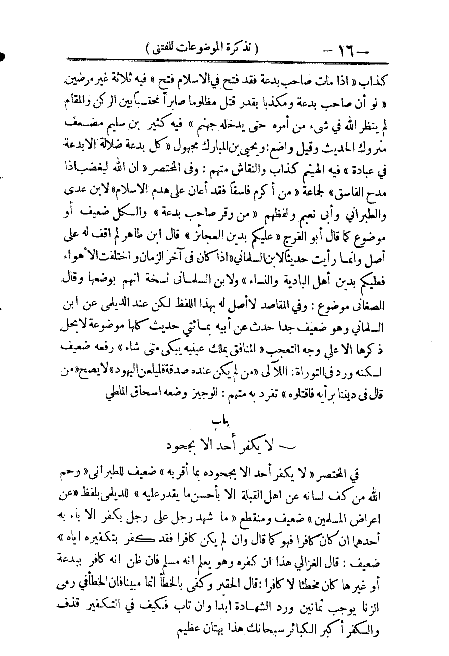 «مَا شَهِدَ رَجُلٌ عَلَى رَجُلٍ بِالْكُفْرِ إِلا بَاءَ بِهِ أَحَدُهُمَا إِنْ كَانَ كَافِرًا فَهُوَ كَمَا قَالَ وَإِنْ لَمْ يَكُنْ كَافِرًا فَقَدْ كَفَرَ بِتَكْفِيرِهِ إِيَّاهُ» ضَعِيفٌ. قَالَ الْغَزالِيّ: هَذَا إِن كفره وَهُوَ يعلم أَنه مُسلم فَإِن ظن أَنه كَافِر ببدعة أَو غَيرهَا كَانَ مخطئا لَا كَافِرًا. قَالَ الحقير: وَكفى بالْخَطَأ إِثْمًا مُبينًا فَإِن الْخَطَأ فِي رمي الزِّنَا يُوجب ثَمَانِينَ ورد الشَّهَادَة أبدا وَإِن تَابَ، فَكيف فِي التَّكْفِير قذف [لَعَلَّه: فَكيف وَفِي التَّكْفِير قذف] ، وَالْكفْر أكبر الْكَبَائِر؟ سُبْحَانَكَ هَذَا بهتان عَظِيم!