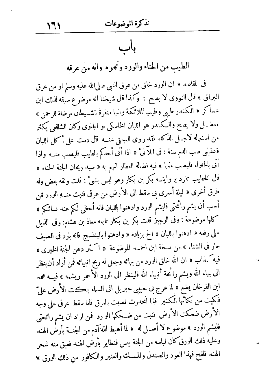 «لَيْلَةَ أُسْرِيَ بِي سَقَطَ إِلَى الأَرْضِ مِنْ عَرَقِي فَنَبَتَ مِنْهُ الْوَرْدُ فَمَنْ أَحَبَّ أَنْ يَشُمَّ رَائِحَتِي فَلْيَشُمَّ الْوَرْدَ وَادَّهِنُوا بِاللَّبَانِ فَإِنَّهُ أَحْظَى لَكُمْ عِنْدَ نِسَائِكُمْ» كلهَا مَوْضُوعَة، وَفِي الْوَجِيز قلت بكر بن بكار تَابعه معَاذ بن هِشَام.