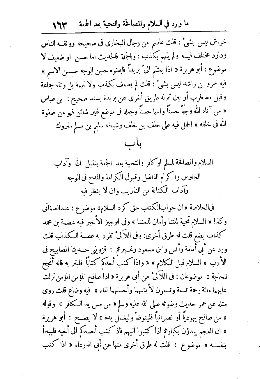 فِي اللآلئ عَن أبي هُرَيْرَة «إِذَا صَافَحَ المؤمنُ المؤمنَ نَزَلَتْ عَلَيْهِمَا مِائَةُ رَحْمَةٍ، تِسْعَةٌ وَتِسْعُونَ لأَبَشِّهِمَا وَأَحْسَنِهِمَا لِقَاءً» فِيهِ وَضَّاعٌ قلت رُوِيَ مثله عَن عمر حَدِيث وضوئِهِ صلى الله عَلَيْهِ وَسلم «من مس يَد كَافِر» وَقَوله «من صَافح يَهُودِيّا أَو نَصْرَانِيّا فَليَتَوَضَّأ وليغسل يَده» لَا يَصح: أَبُو هُرَيْرَة "إِن الْعَجم يبدؤون إِذا كتبُوا إِلَيْهِم فَإِذا كتب أحدكُم إِلَى أَخِيه فليبدأ بِنَفسِهِ مَوْضُوع: قلت لَهُ طرق أُخْرَى مِنْهَا عَن أبي الدَّرْدَاء «إِذا كتب -[164]- أحدكُم إِلَى إِنْسَان فليبدأ بِنَفسِهِ وَإِذا كتب فليترب كِتَابه فَإِنَّهُ أنجح» .