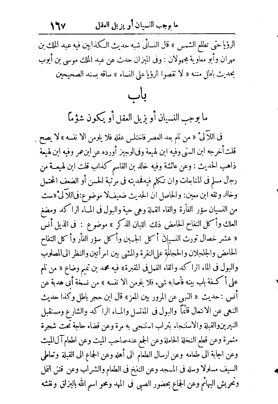 فِي اللآلئ «مَنْ نَامَ بَعْدَ الْعَصْرِ فَاخْتُلِسَ عَقْلُهُ فَلا يَلُومَنَّ إِلا نَفْسَهُ» لَا يَصح قلت أخرجه ابْن السّني وَفِيه ابْن لَهِيعَة وَفِي الْوَجِيز أوردهُ عَن ابْن عمر وَفِيه ابْن لَهِيعَة ذَاهِب الحَدِيث، وَعَن عَائِشَة وَفِيه خَالِد بن الْقَاسِم كَذَّاب قلت ابْن لَهِيعَة من رجال مُسلم فِي المتابعات وَإِن تكلم فِيهِ فَحَدِيثه فِي مرتبَة الْحسن أَو الضعْف الْمُحْتَمل وخَالِد وَثَّقَهُ ابْن معِين، وَالْحَاصِل أَن الحَدِيث ضَعِيف لَا مَوْضُوع.