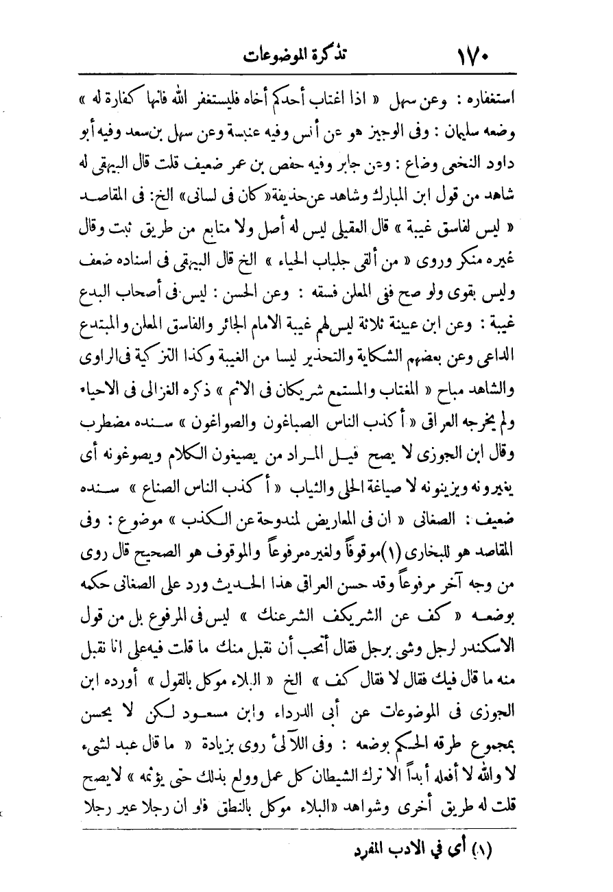 الصغاني «إِنَّ فِي الْمَعَارِيضِ لَمَنْدُوحَةٌ عَنِ الْكَذِب» مَوْضُوع، وَفِي الْمَقَاصِد هُوَ للْبُخَارِيّ (¬1) مَوْقُوفا وَلغيره مَرْفُوعا وَالْمَوْقُوف هُوَ الصَّحِيح قَالَ رُوِيَ من وَجه آخر مَرْفُوعا وَقد حسن الْعِرَاقِيّ هَذَا الحَدِيث ورد على الصغاني حكمه بِوَضْعِهِ