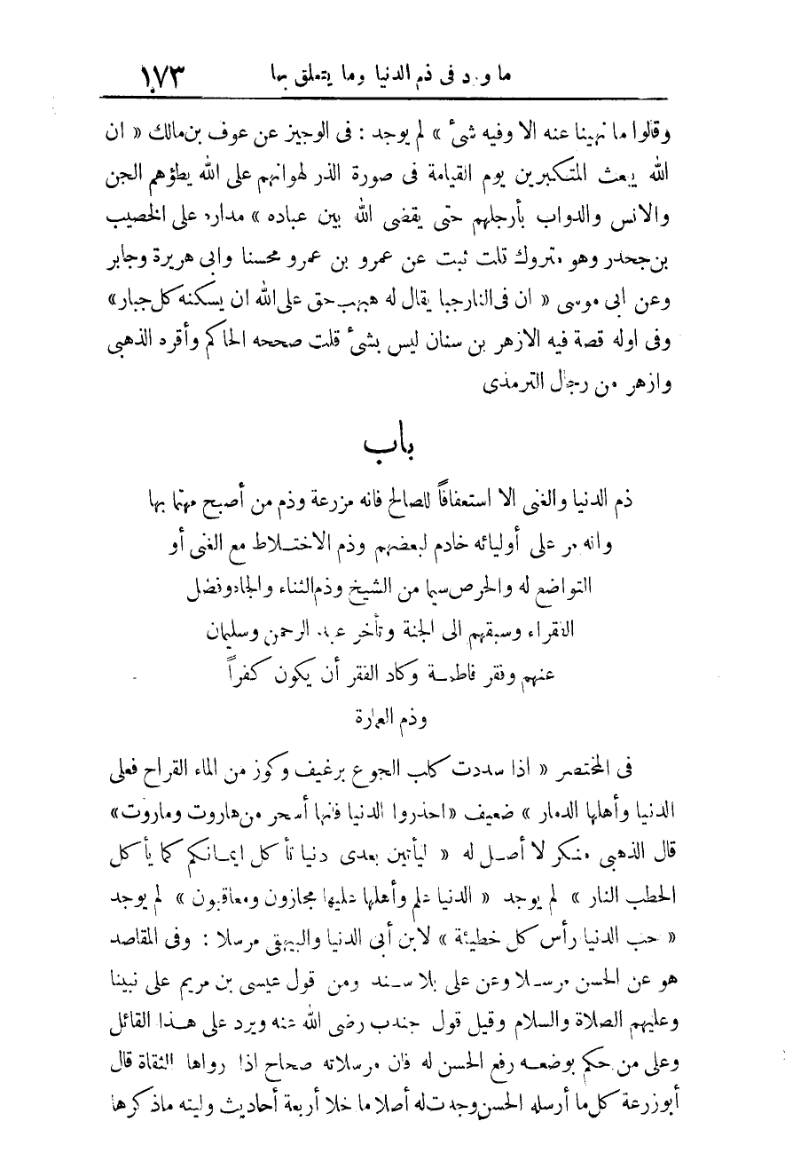 بَابُ ذَمِّ الدُّنْيَا وَالْغِنَى إِلا اسْتِعْفَافًا لِلصَّالِحِ فَإِنَّهُ مَزْرَعَةٌ وَذَمِّ من أصبح مهتما بهَا وَأَنه مر على أوليائه خَادِم لبَعْضهِم وذم الِاخْتِلَاط مَعَ الْغَنِيّ أَو التَّوَاضُع لَهُ والحرص سِيمَا من الشَّيْخ وذم الثَّنَاء والجاه وَفضل الْفُقَرَاء وسبقهم إِلَى الْجنَّة وَتَأَخر عبد الرَّحْمَن وَسليمَان عَنْهُم وفقر فَاطِمَة وَكَاد الْفقر أَن يكون كفرا وذم الْعِمَارَة.